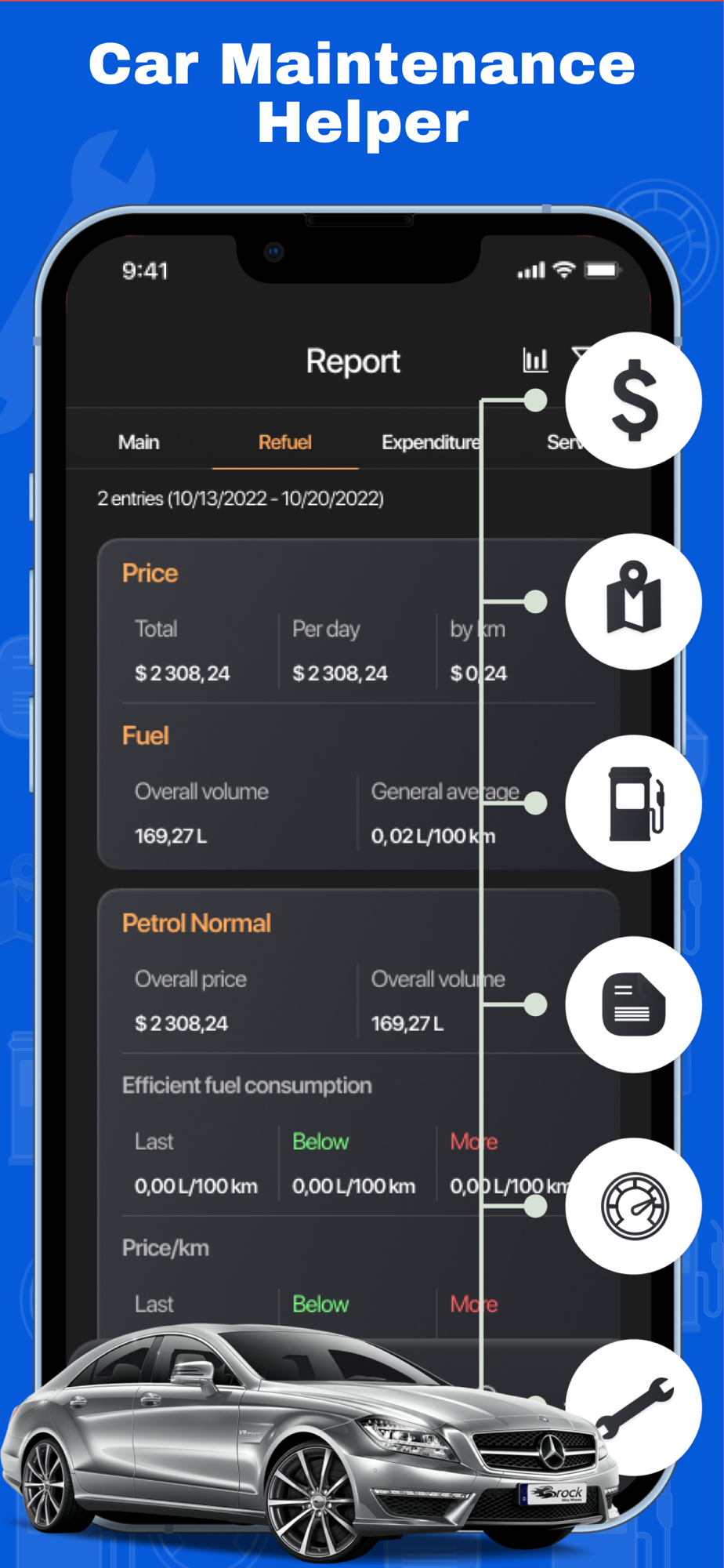 - Keeps statistics on car maintenance