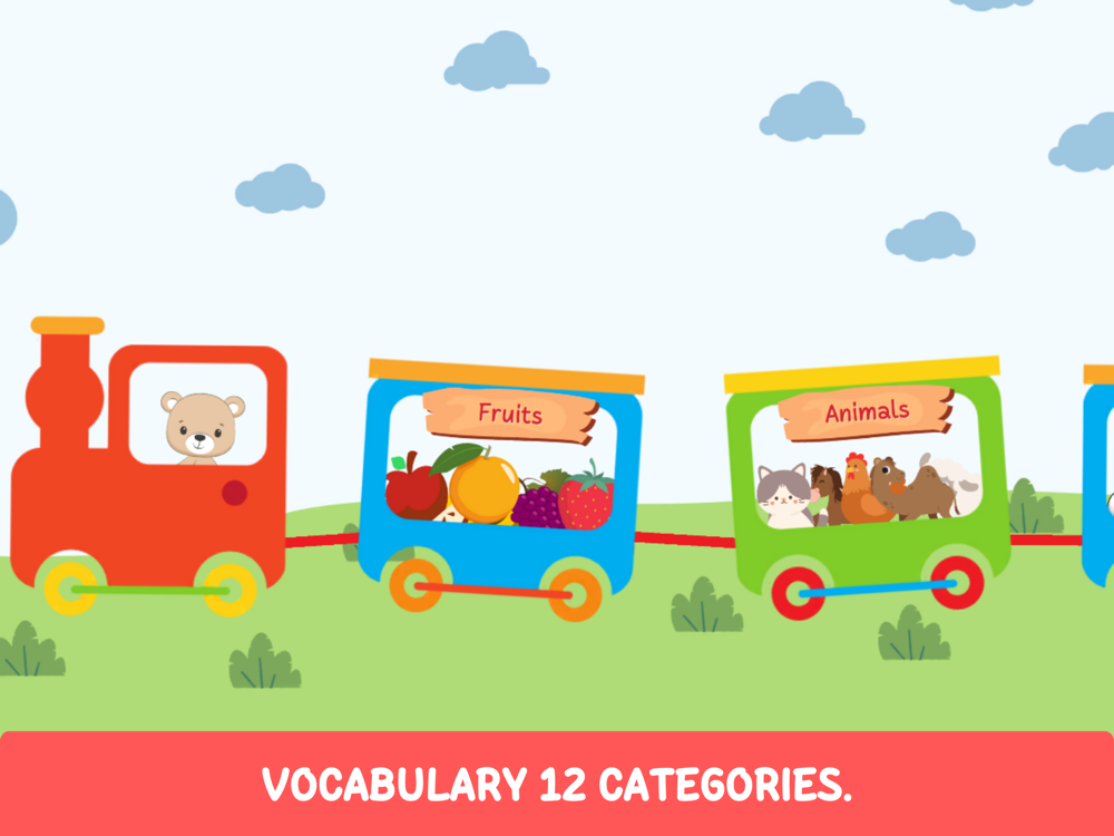 This matching game helps your little one learn vocabulary in 12 topics: fruits, wild animals, vegetables, aquatic animals, bedroom, bathroom, food, house, school, shapes, toys, cars, etc.