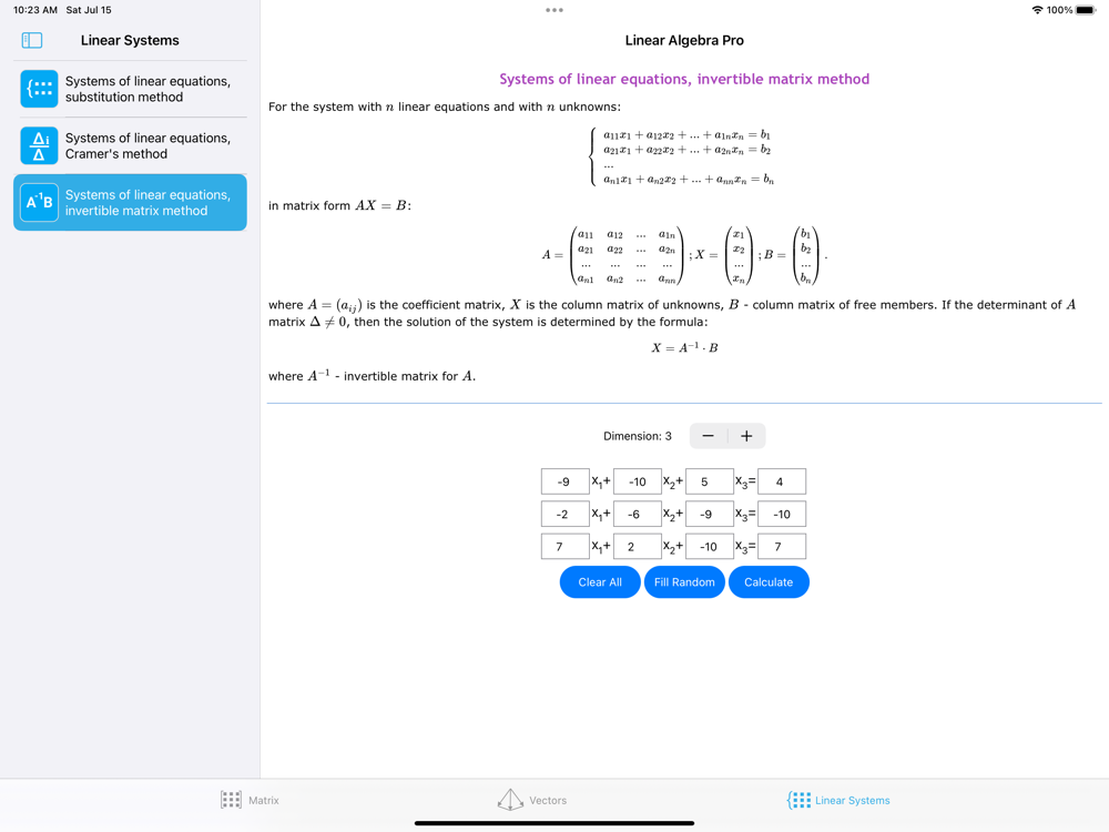 The application for matrices, vectors operations and system of linear equations, it is very useful tool. This app is designed for students and engineers who use operations with matrices and vectors in their studies or work. The program, using the necessary formulas, will perform step-by-step calculations and display a detailed solution.