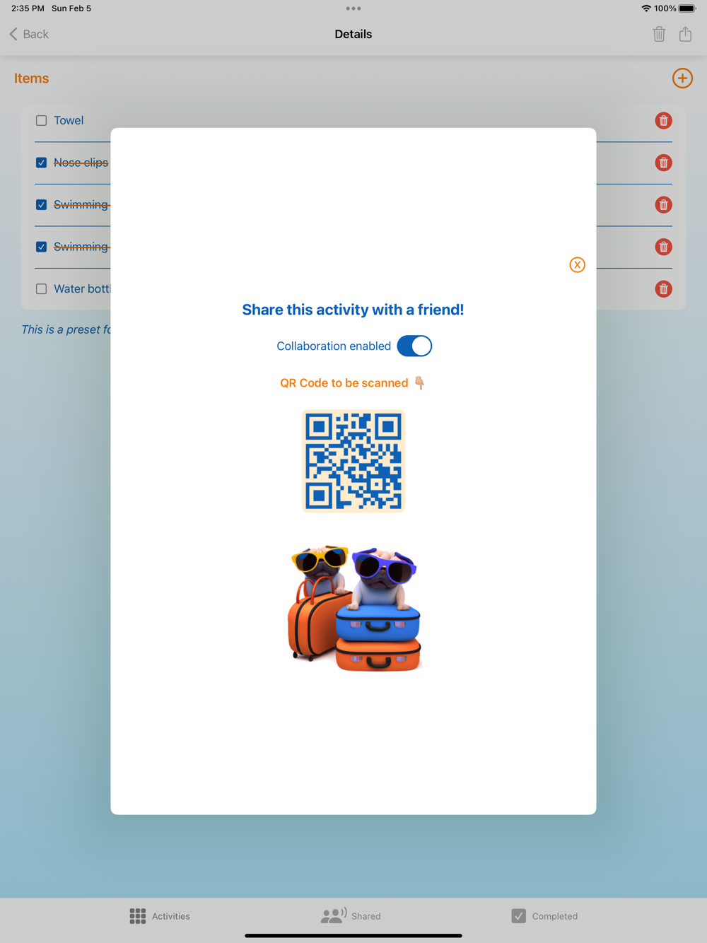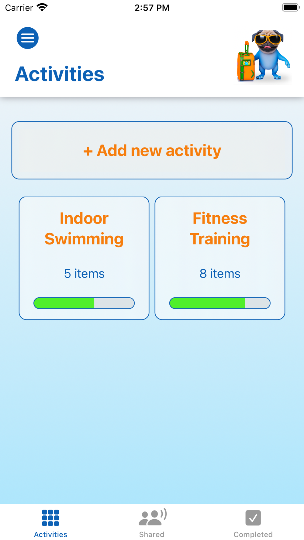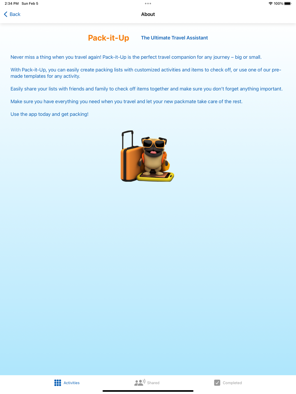 With Pack-it-Up, you can easily create packing lists with customised activities and items to check off, or use one of our pre-made templates for any activity.