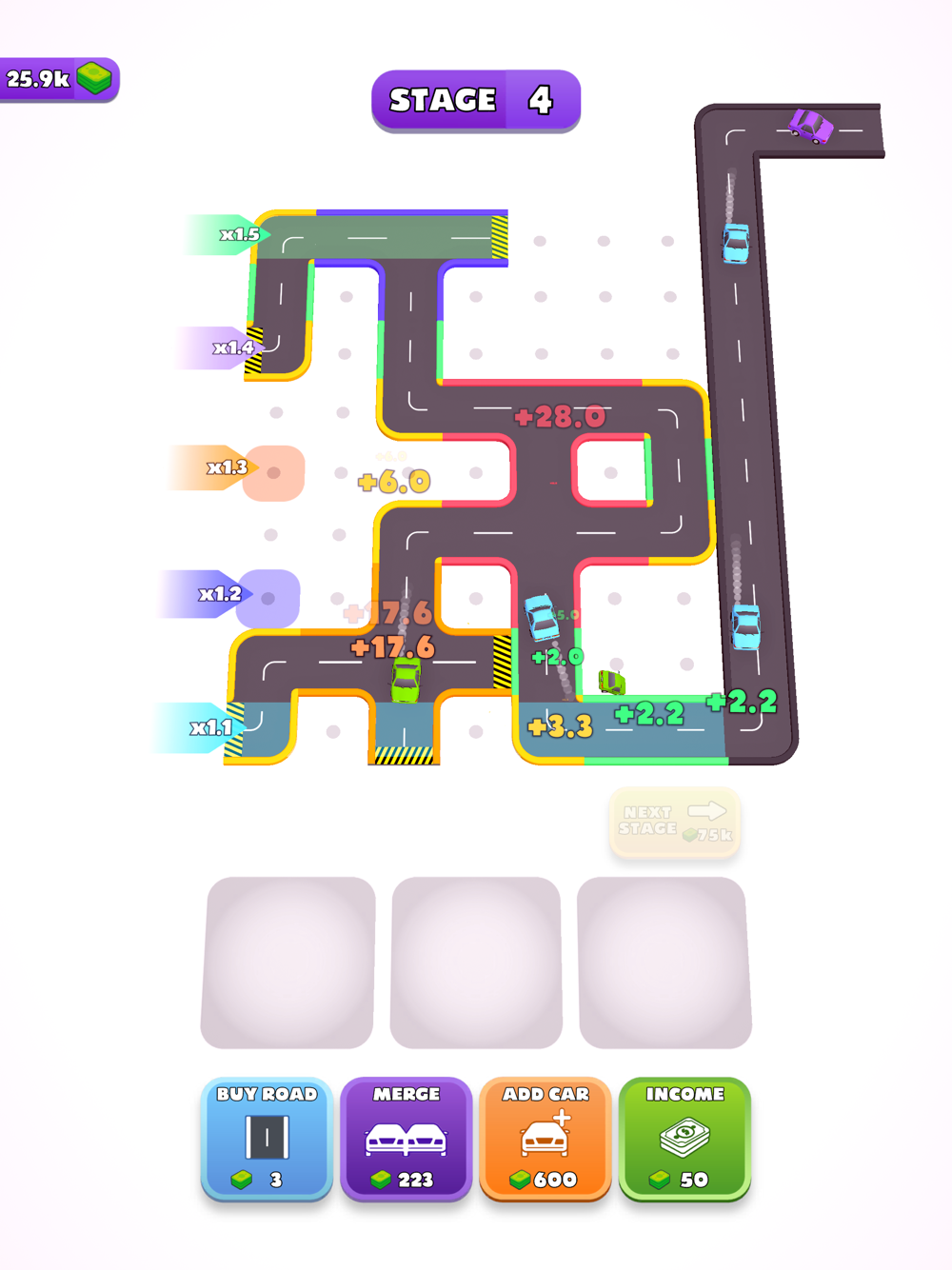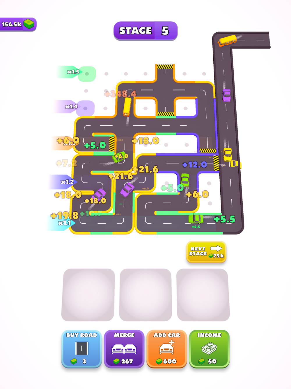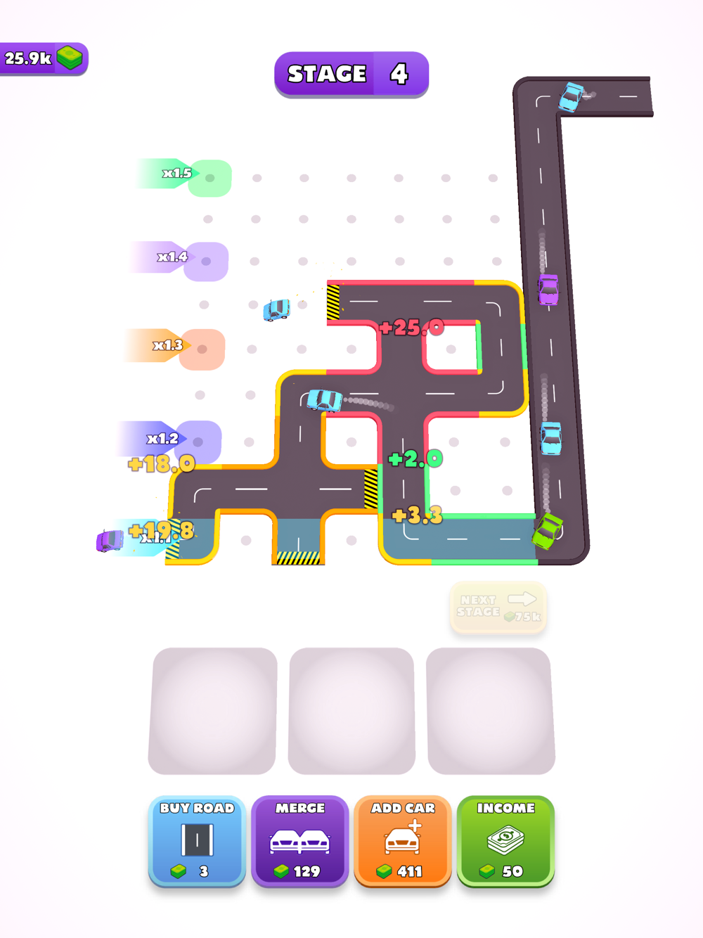 Earn money each time a car passes through the road you placed. Therefore, you have to place the roads wisely. More cars means more money. So don't be afraid to buy cars. Reach the target and pass the level.