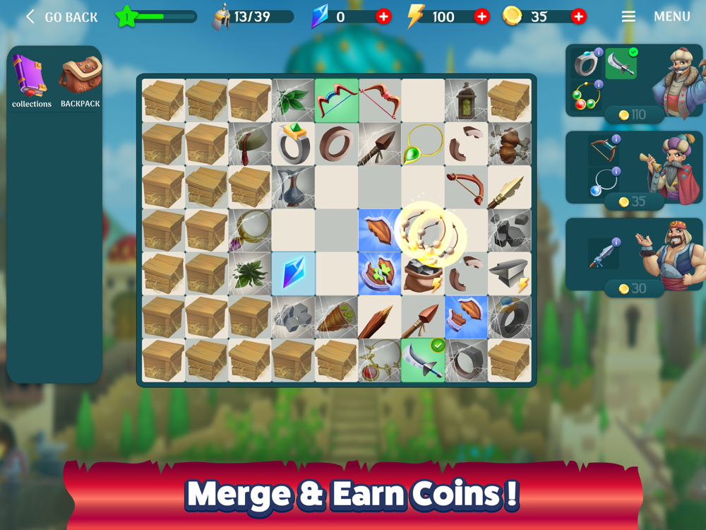 Sell your goods at the souk, earn gold and train soldiers at the barracks. Fight your enemies and collect treasure chests to find boosters, coins and endless lives. As you explore and conquer new lands, match and merge objects into even more powerful weapons, glorious jewels and luxurious items.
