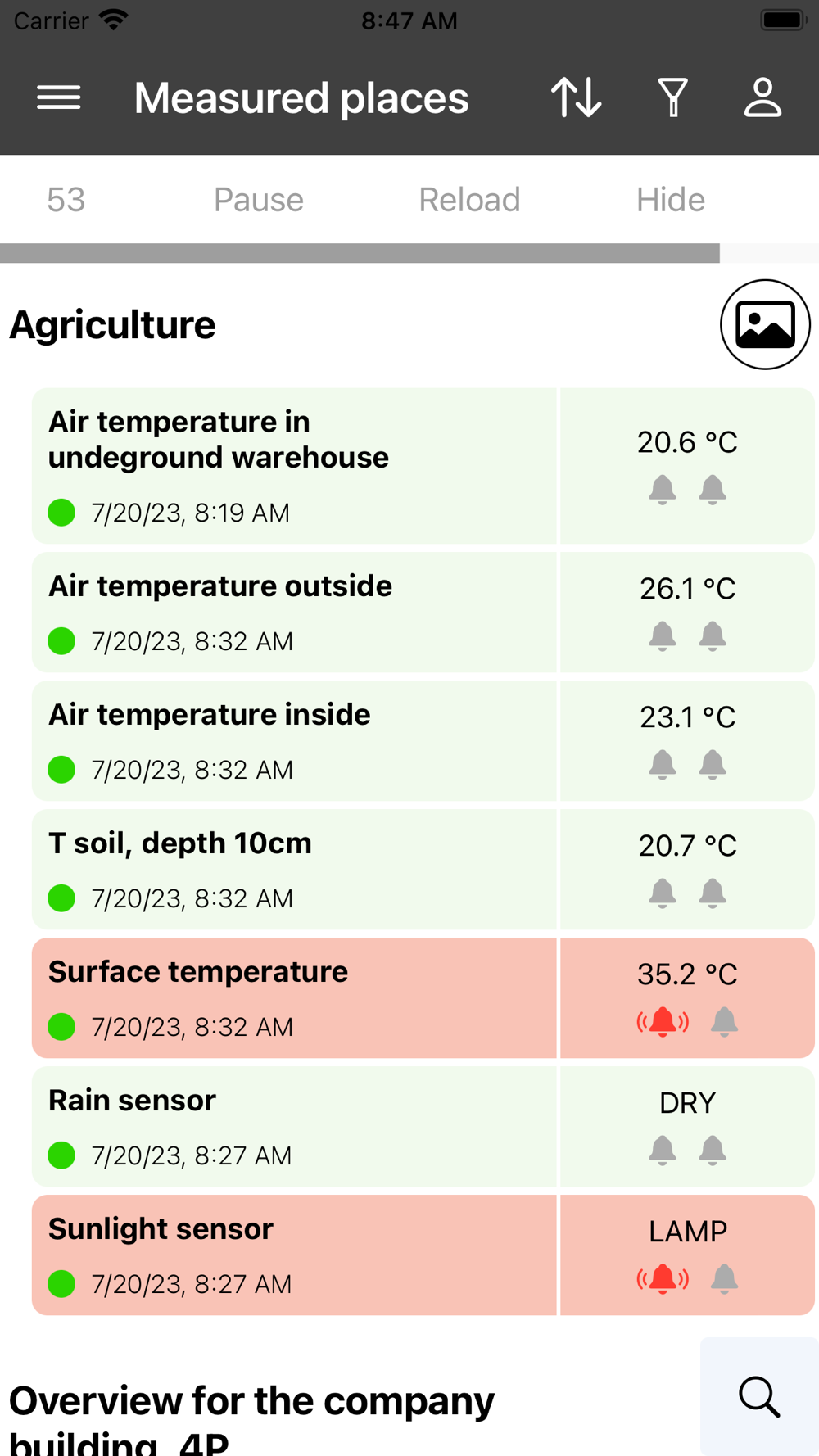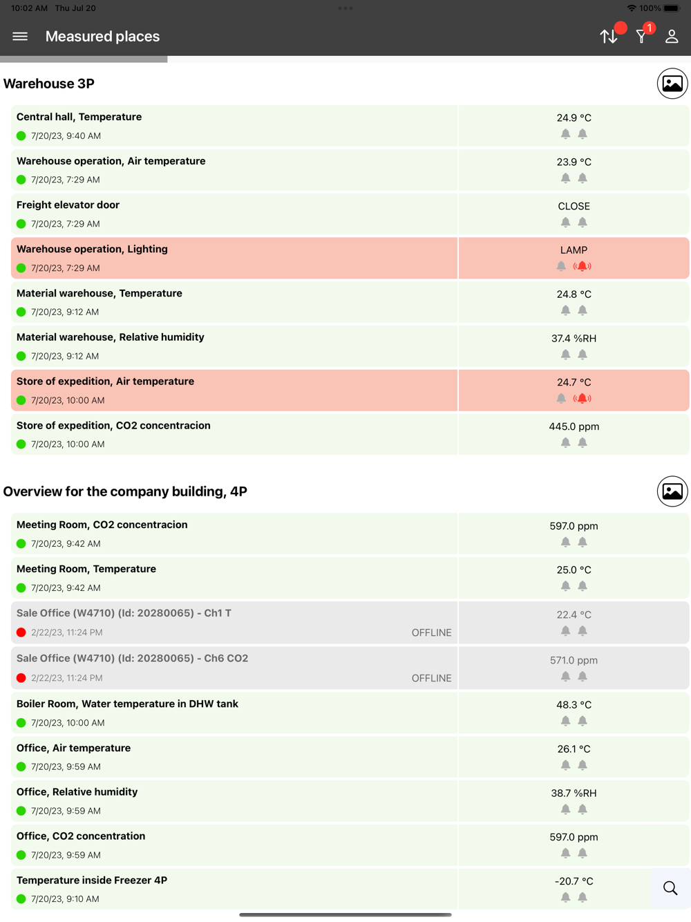 The app allows users to view cloud messages and receive notifications of alarms and other events. In the application, it is also possible to display an overview of the devices (My Devices) and measured places.
