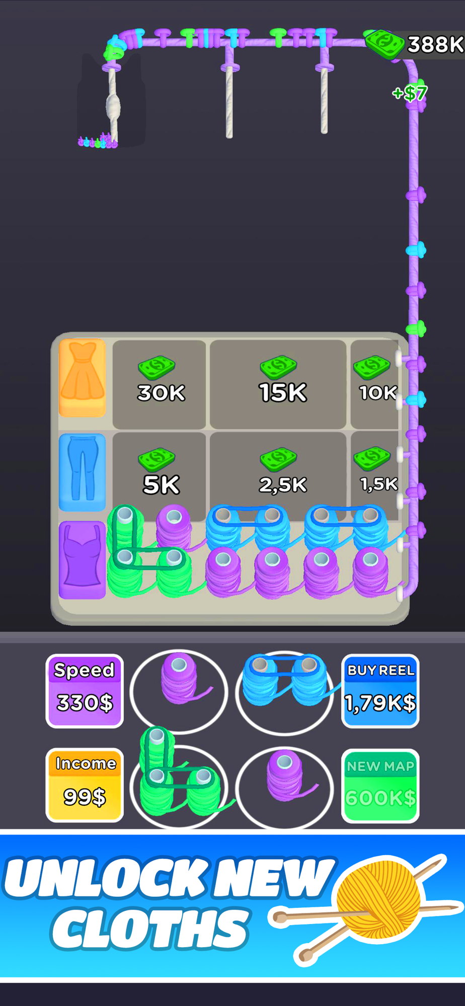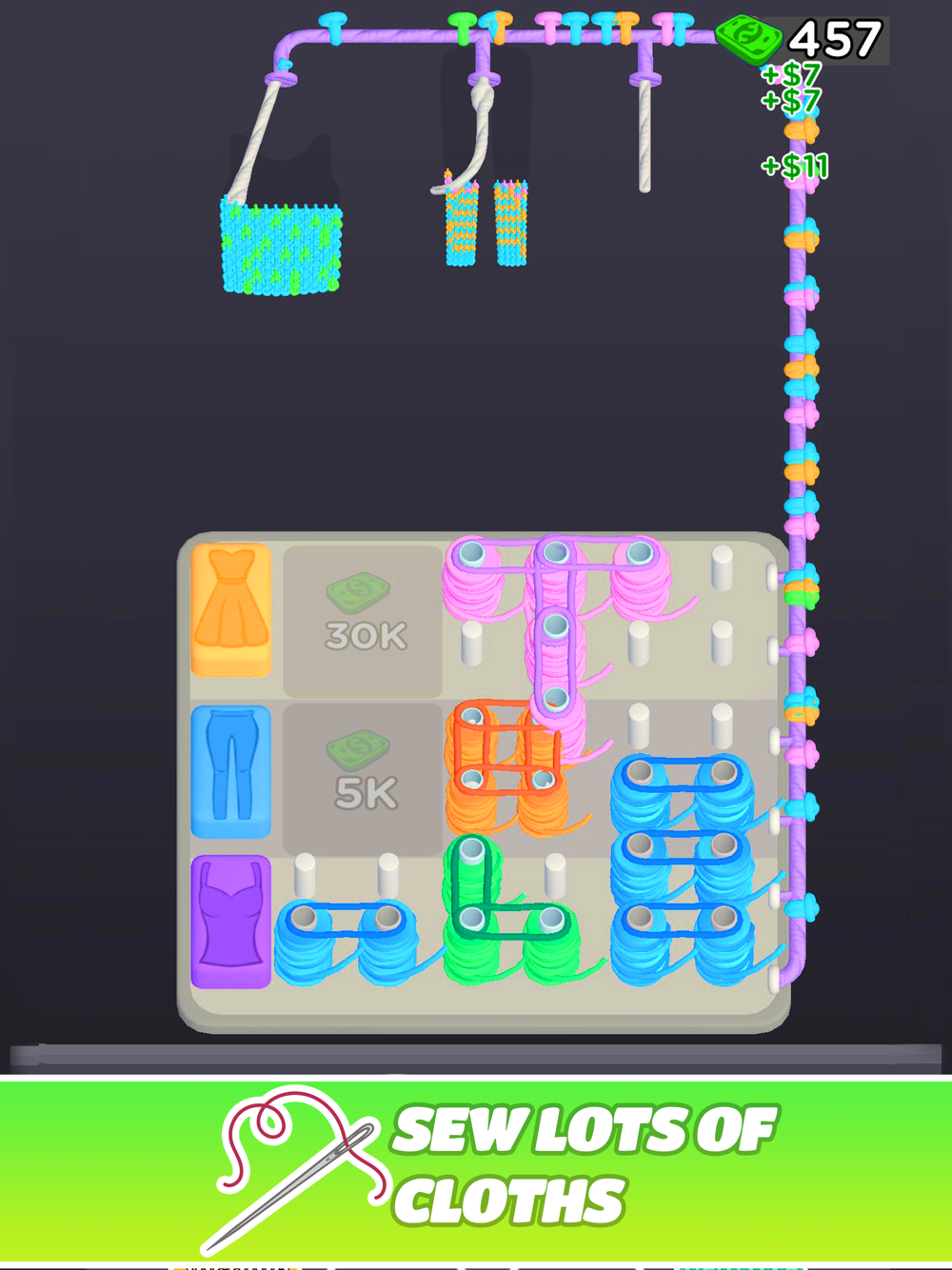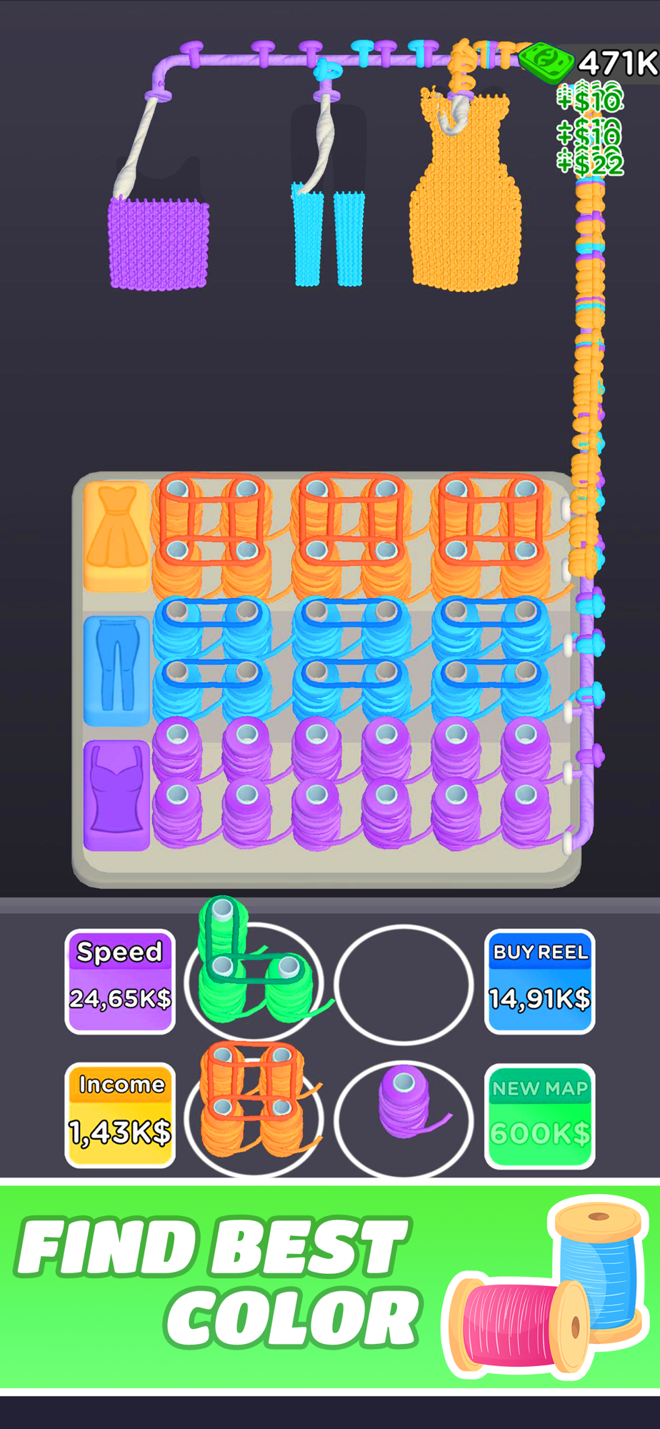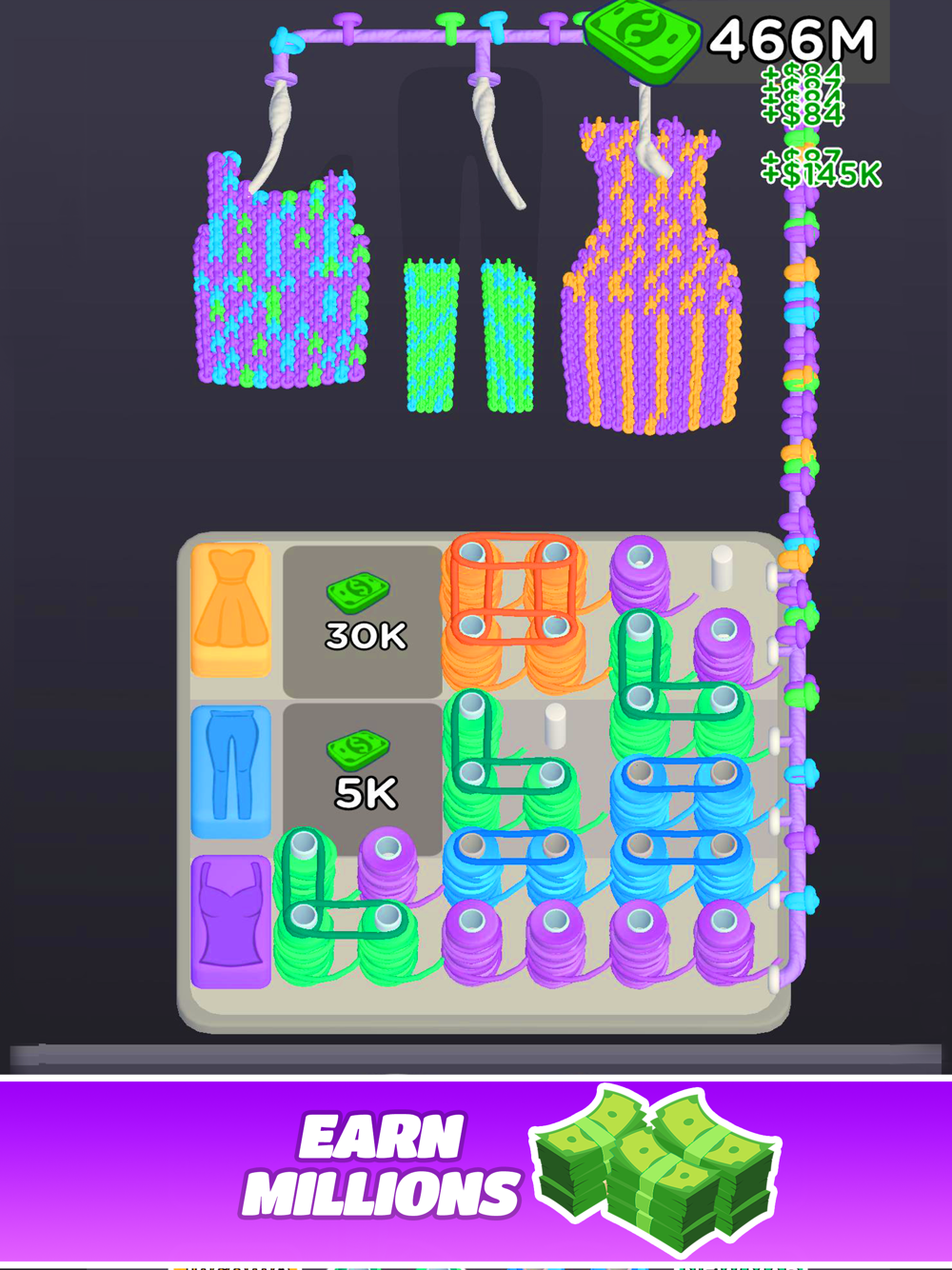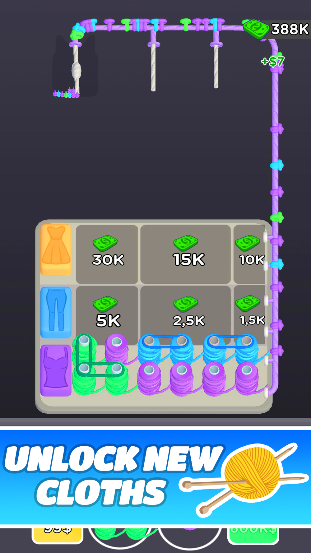 Get ready to knit your way to success with our new game! Purchase reels and strategically place them on the board to create a beautiful dress. As the strings are knitted into dress parts, you'll earn money to purchase new reels and improve your designs. Merge reels together to create unique color combinations and patterns for even better-looking dresses that earn you even more money! With addictive gameplay and endless possibilities, this is a game that'll have you knitting for hours. Download now and show off your knitting skills to the world!