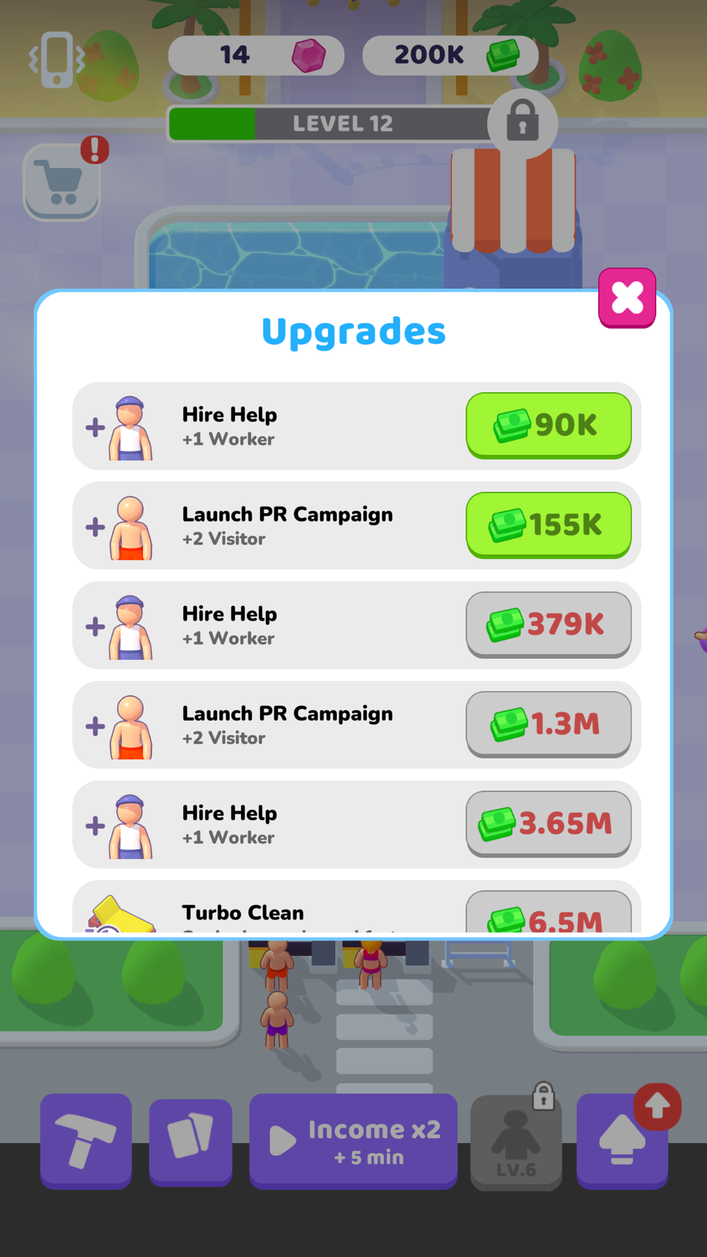 Challenge yourself trying to avoid long queues with angry people - it’s your chance to upgrade all your management skills. Make your aquapark business work the way you want it to! Dive into the game now and build, expand, and manage your own water park empire. Create unforgettable experiences for your guests and watch the entire business grow while you’re relaxing!