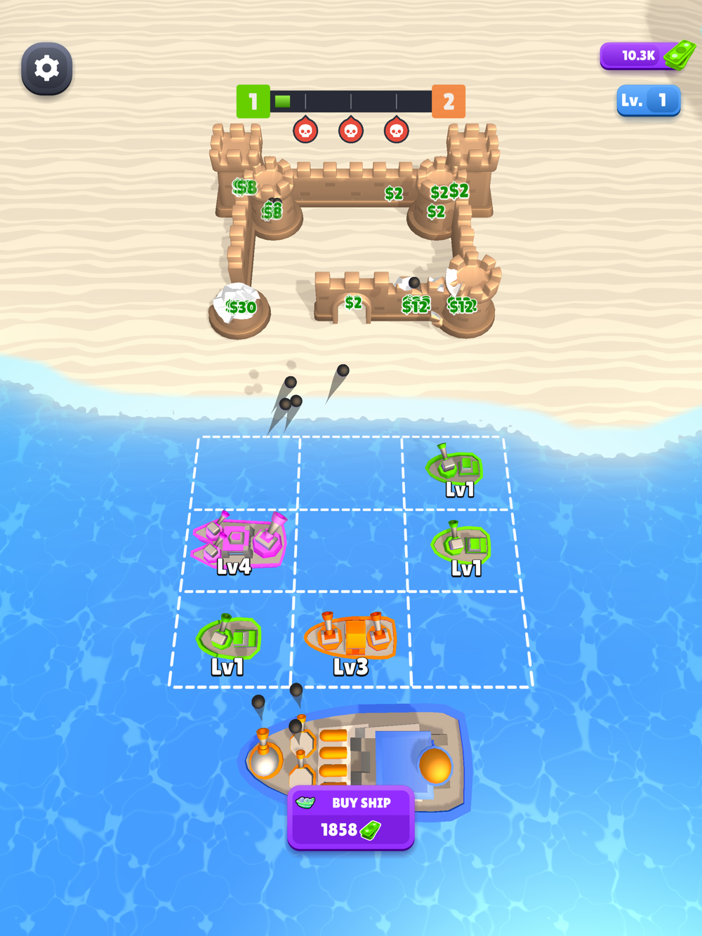 Buy ships and merge them to have higher level ships. Set where your ships should be fired with the crosshair. They are waiting for your command.