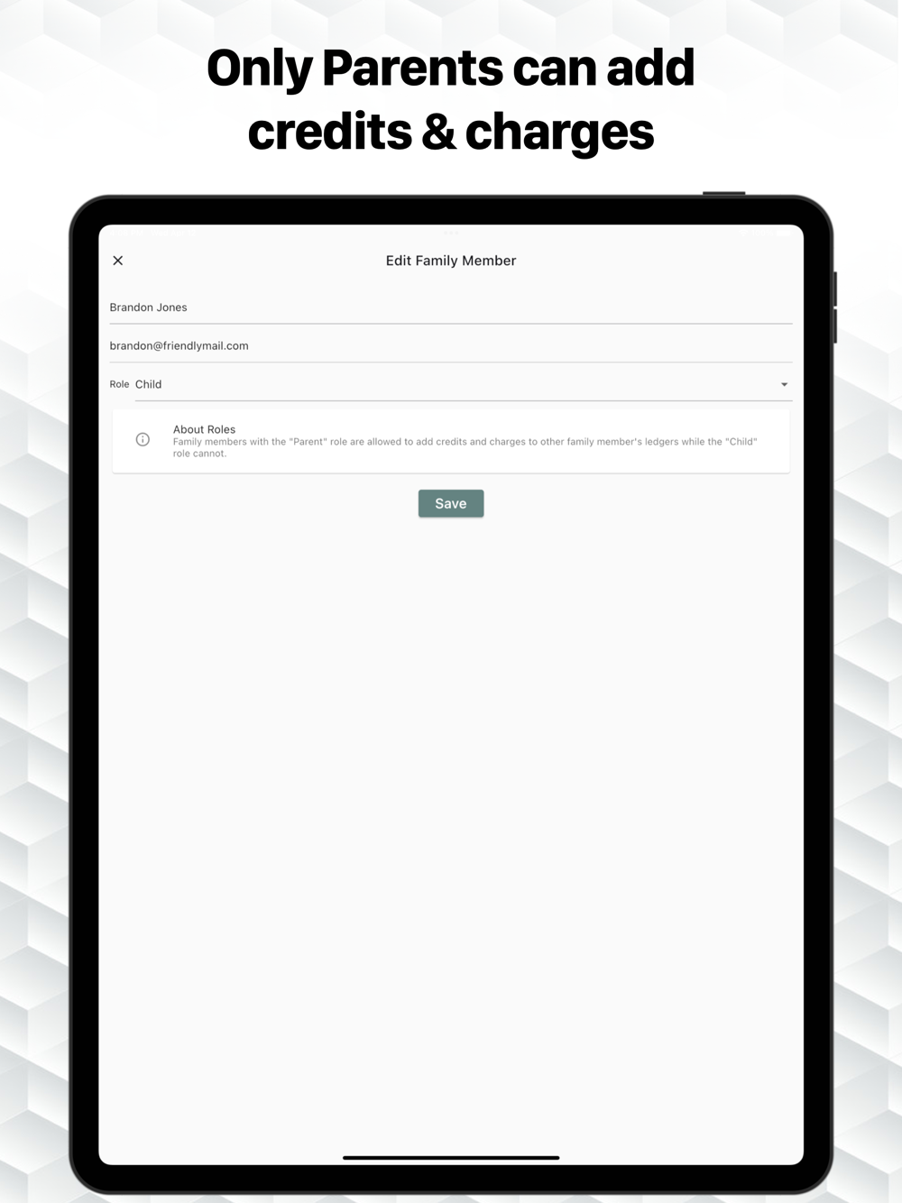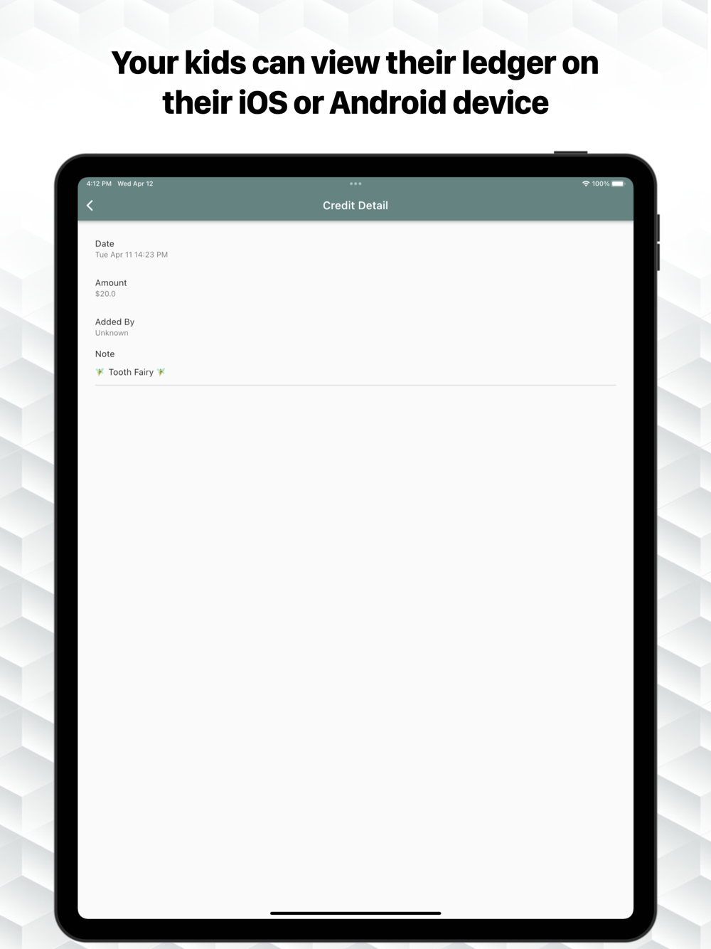 Children cannot add credits and charges to their own ledger but they are notified when you add credits and charges to their ledger. And they can view their balance any time for free by installing the app on their device.