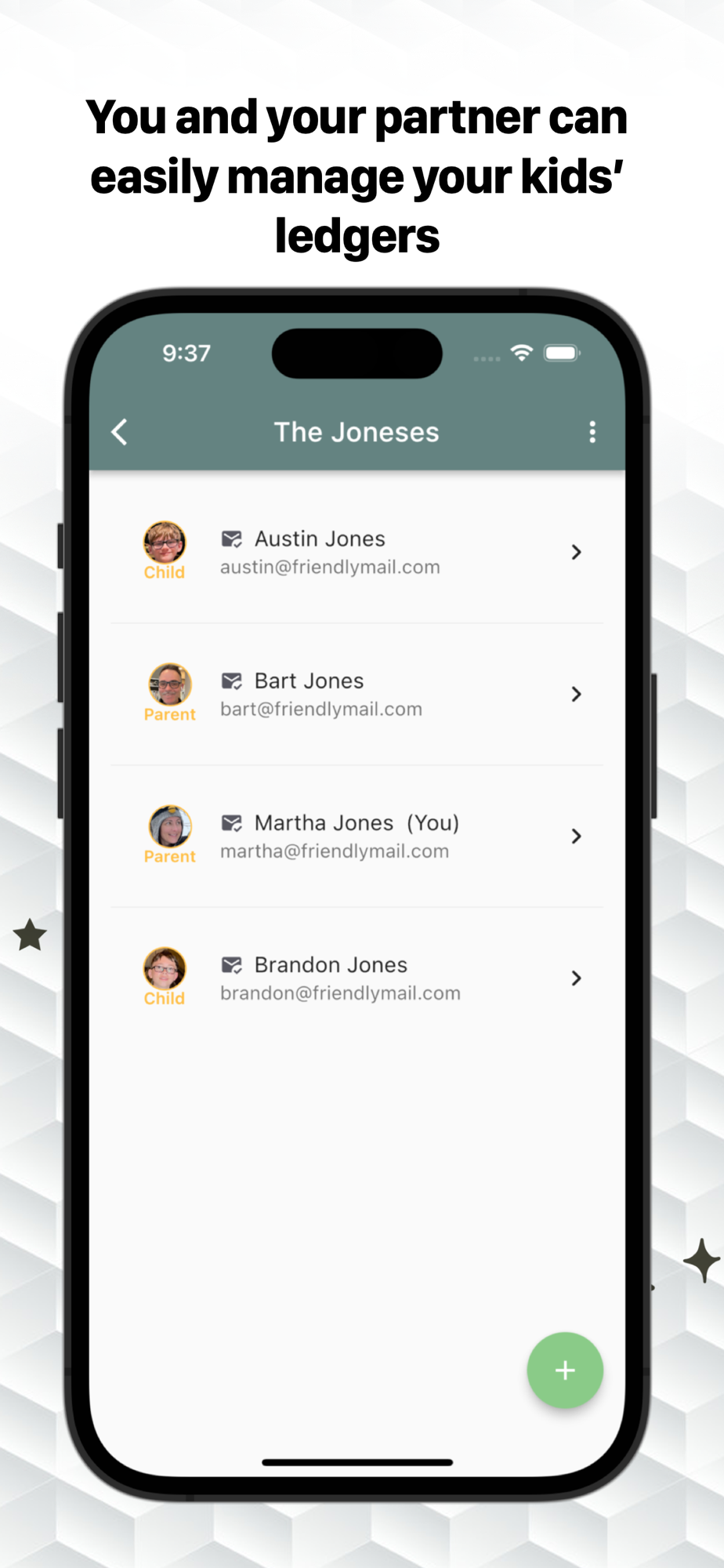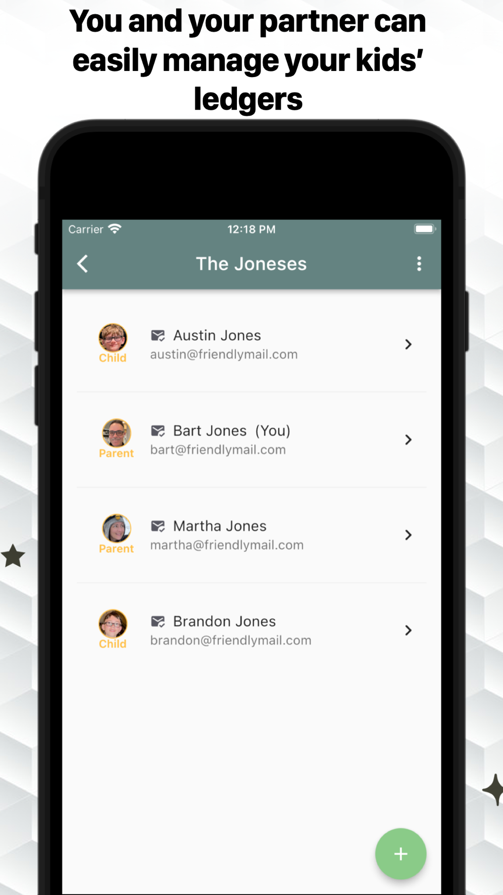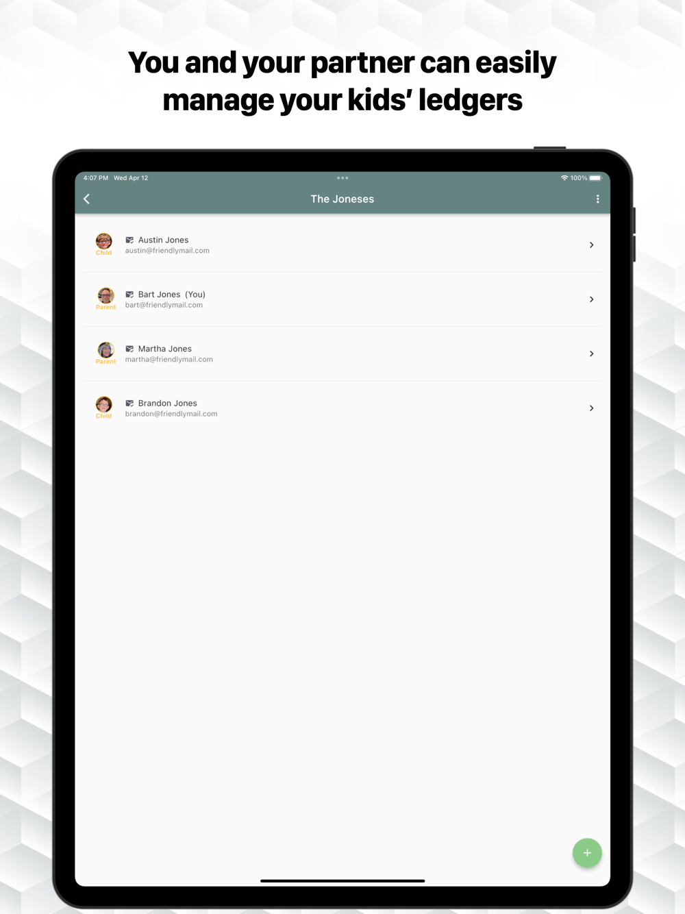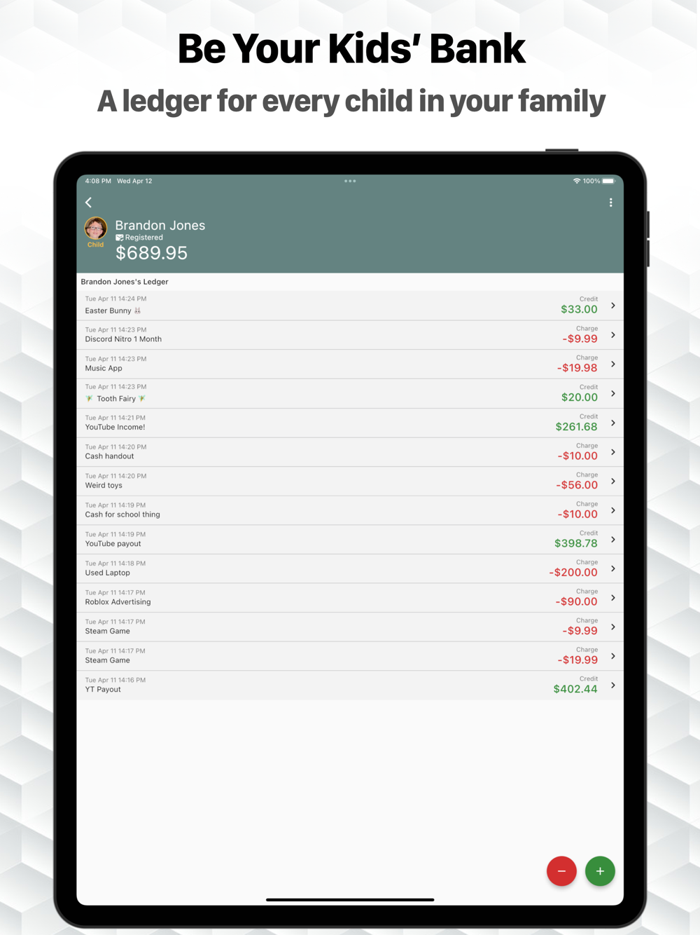Create a ledgers for your kids. You (the parent) can create a ledger for each child in your family. You and your partner can edit the ledger by adding credits and charges. Your child's balance is prominently displayed on your child's Ledger Detail page.