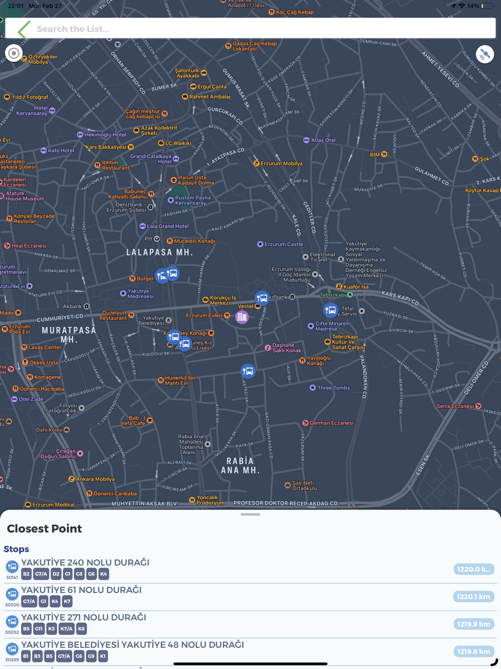 Erzurum Kart uygulaması ile şehir içi ulaşımda kendi rotanızı çizebilir, haritadan çevrenizdeki durakları ve beklediğiniz aracın geliş saatini görebilir, araç hareket saatlerini takip edebilir ve duraktan geçen hatları izleyebilirsiniz.