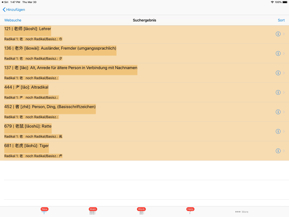 ca. 1000 Chinesische Wörter und Ausdrücke. Alle Einträge sind beliebig erweitert- und editierter. Zu den ersten beiden neu aufgenommenen Chinesischen Zeichen wird automatisch das Radikal herausgesucht. Wortsuche nach Radikal wird unterstütz.