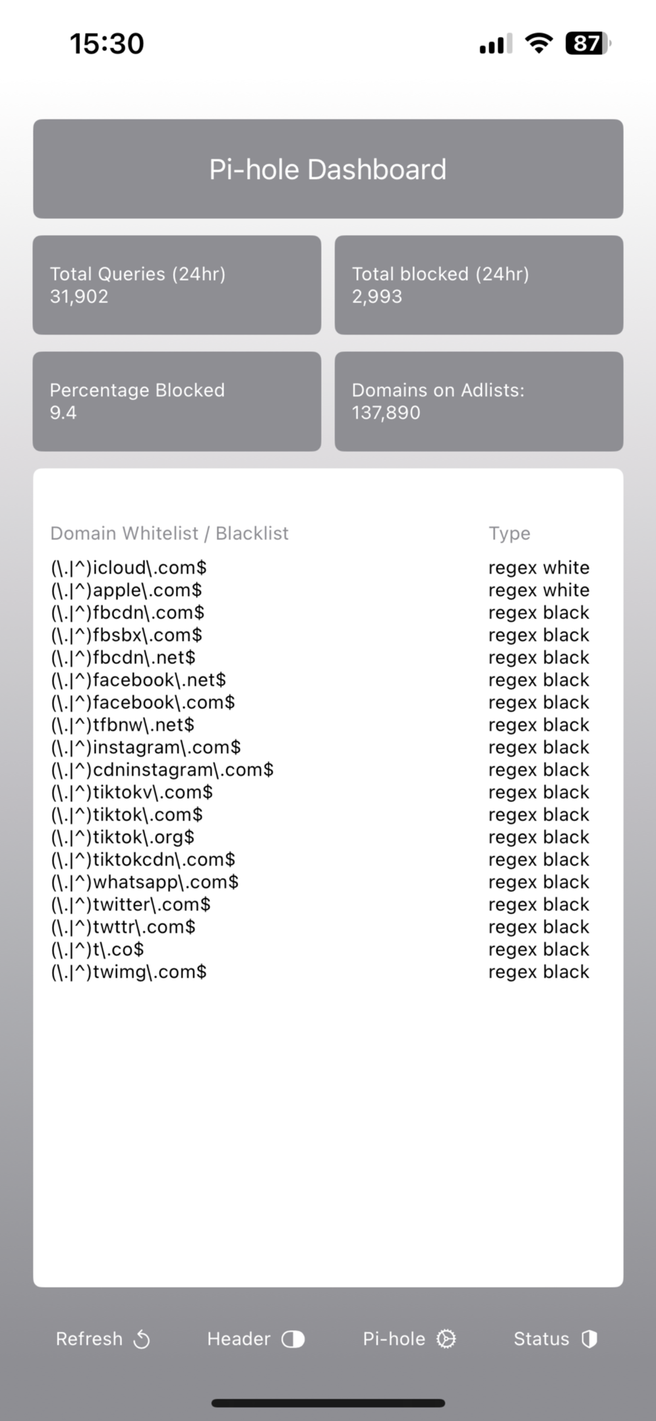 - check Whitelist, Regex Whitelist, Blacklist and Regex Blacklisted domains