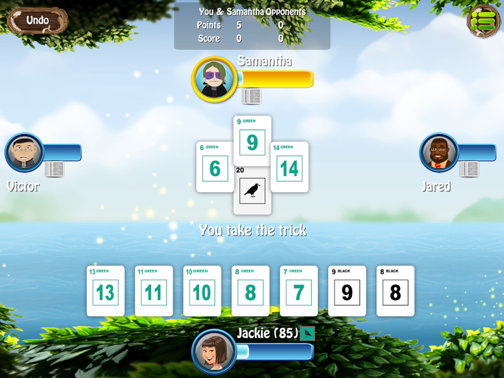 This app is a card game similar to tournament rook. Play with 12 different AI characters, each programmed with different skill levels and playing styes.