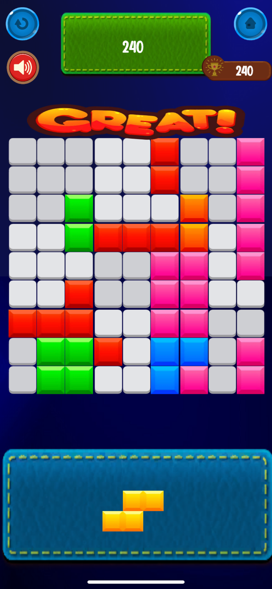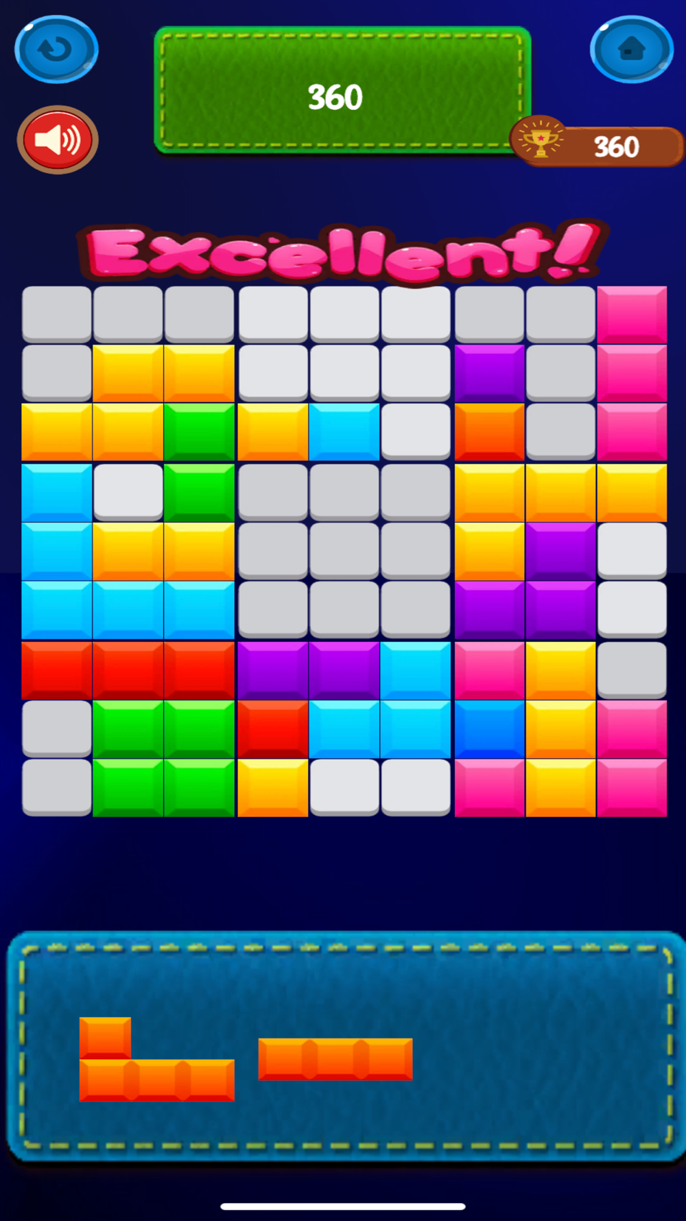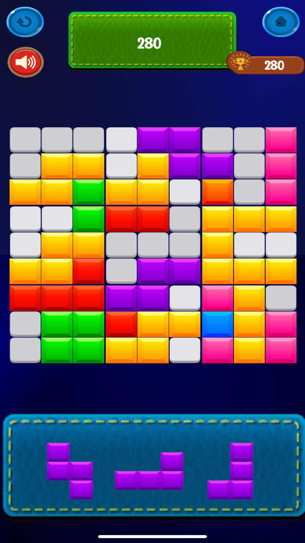 Your mission is to think carefully and fill the empty space using shapes, to complete lines or squares . and trying to reach the highest score, the colors of the blocks will change when the player reached a certain score. there are 5 different colors. the player loses when there is no compatibility between shapes and the grid (there is no place for the shapes).