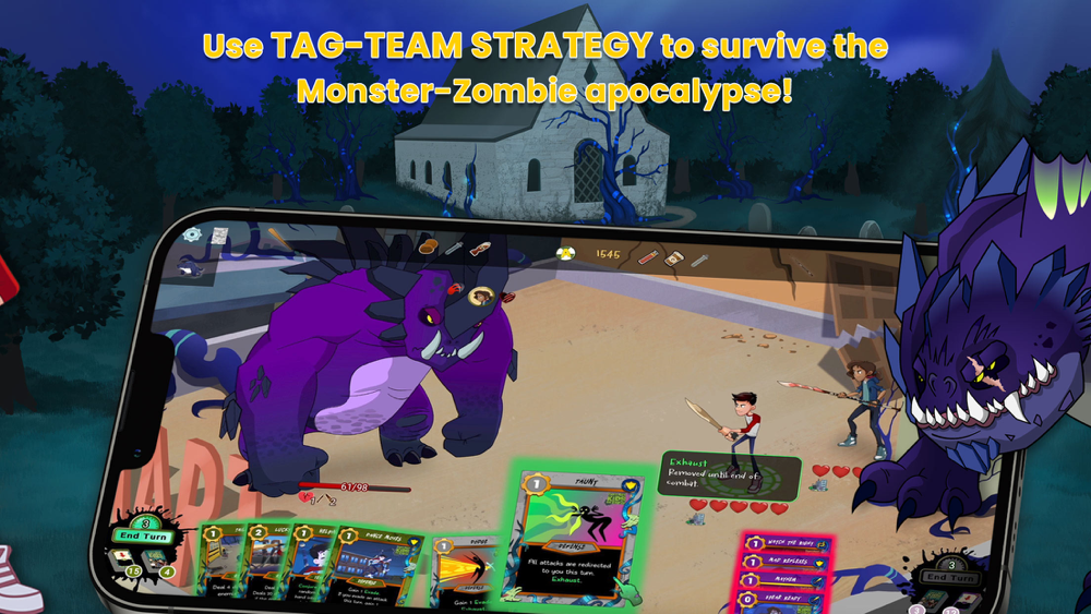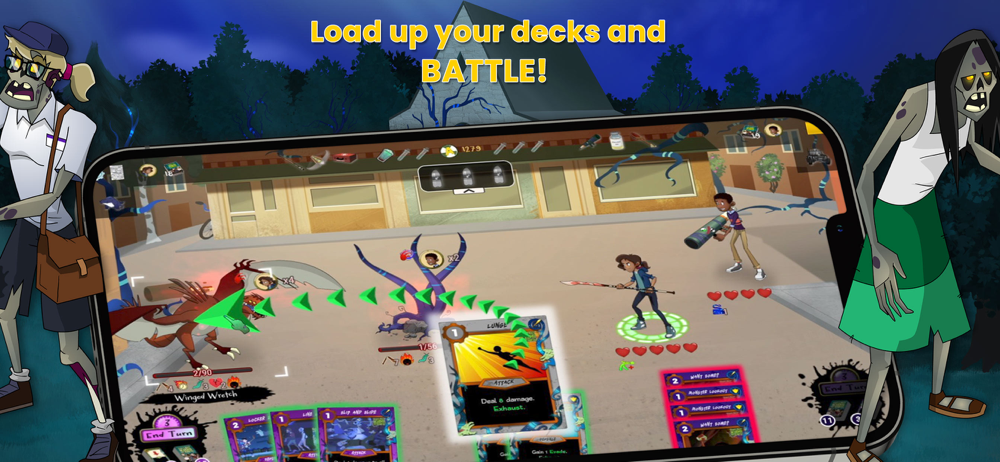In this rogue-like card game, assemble the perfect deck for tag-team combat in this cuckoo bananas post-apocalyptic world. Each character has their own unique strengths and weaknesses. Abandoned foster kid and monster-slaying tough guy survivor Jack is great at teamwork and fights harder when his health is down. June is an expert at kicking zombie butt as she is adept at seeing monster intentions and evading attacks. Super-rad scientist Quint can choose his gear on the fly and is exceptional at using buffs and debuffs, while former bully Dirk is a super-strong monster-battling tornado who can shield anyone in combat.