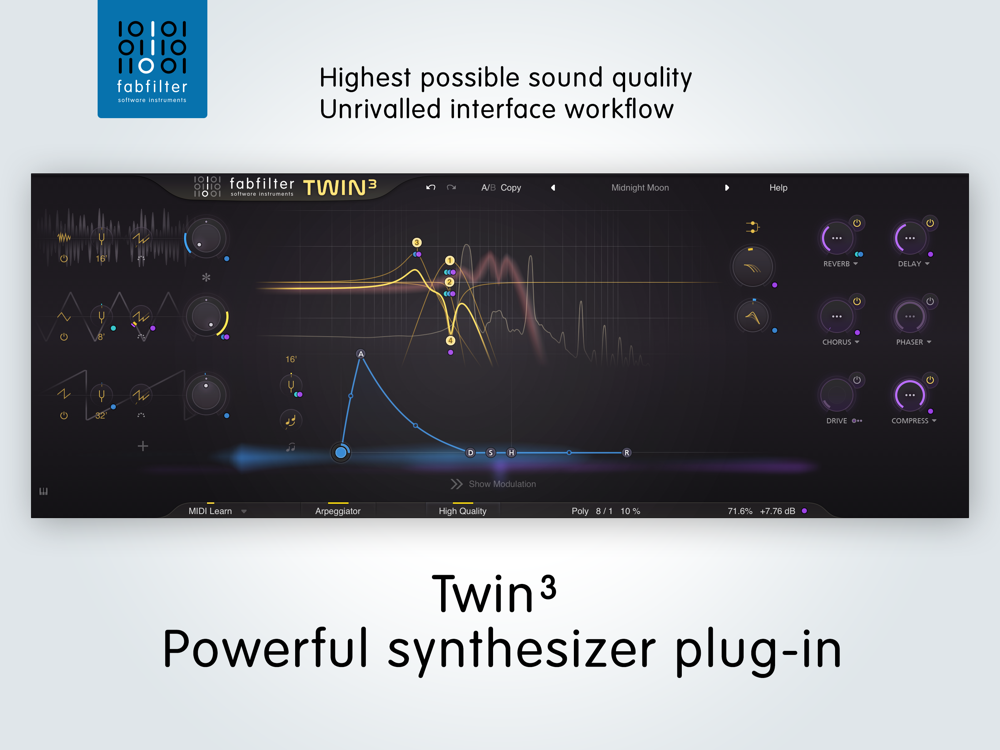 Since its first release in 2005, FabFilter Twin has been famous for its filter quality and oscillator sound. FabFilter Twin 3 expands and improves on its predecessors in every area, including a complete redesign of the GUI and workflow, more and better oscillators and filters, a radically powered-up modulation system, an all-new FX section, and much more. Sonically versatile, supremely intuitive, and spectacularly ‘analog’, Twin 3 is a dream instrument for creating synth sounds of all kinds, from basses, leads, and pads to plucks, drums, effects, and beyond.