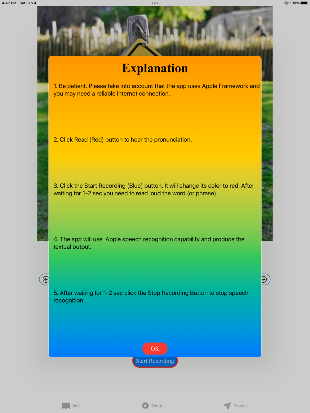 Users should pronounce words or phrases and the app will use speech recognition capability to translate audio content into text and evaluate your pronunciation.