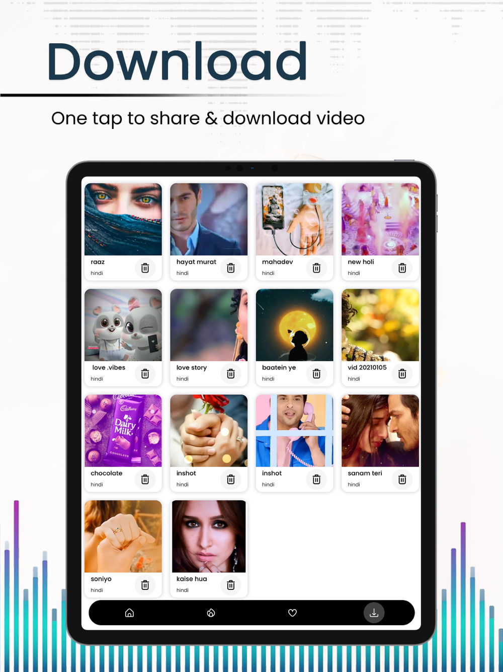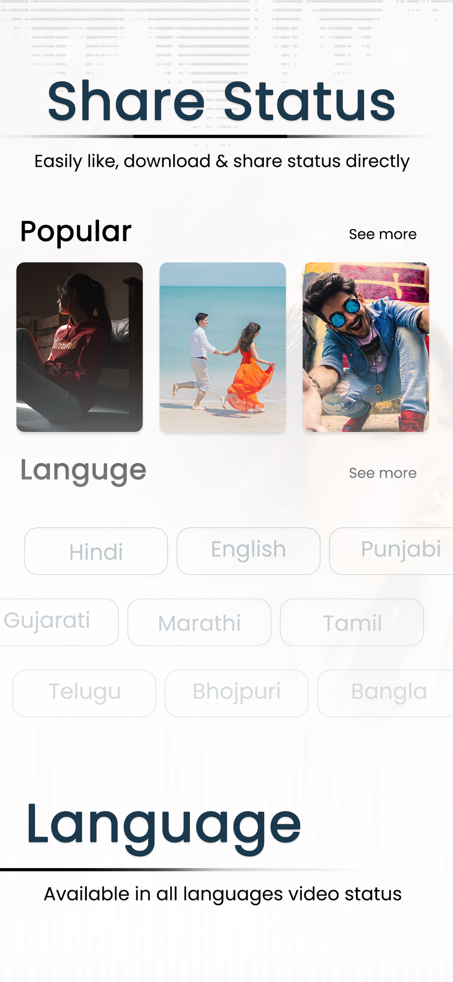 Multiple Language : Would you like to download free status video in Hindi, English, Gujarati, Marathi, Punjabi, Tamil, Telugu, Kannada, Bengali, Malayalam, Bhojpuri, Haryanvi, Bangla, Odia and many more status video.