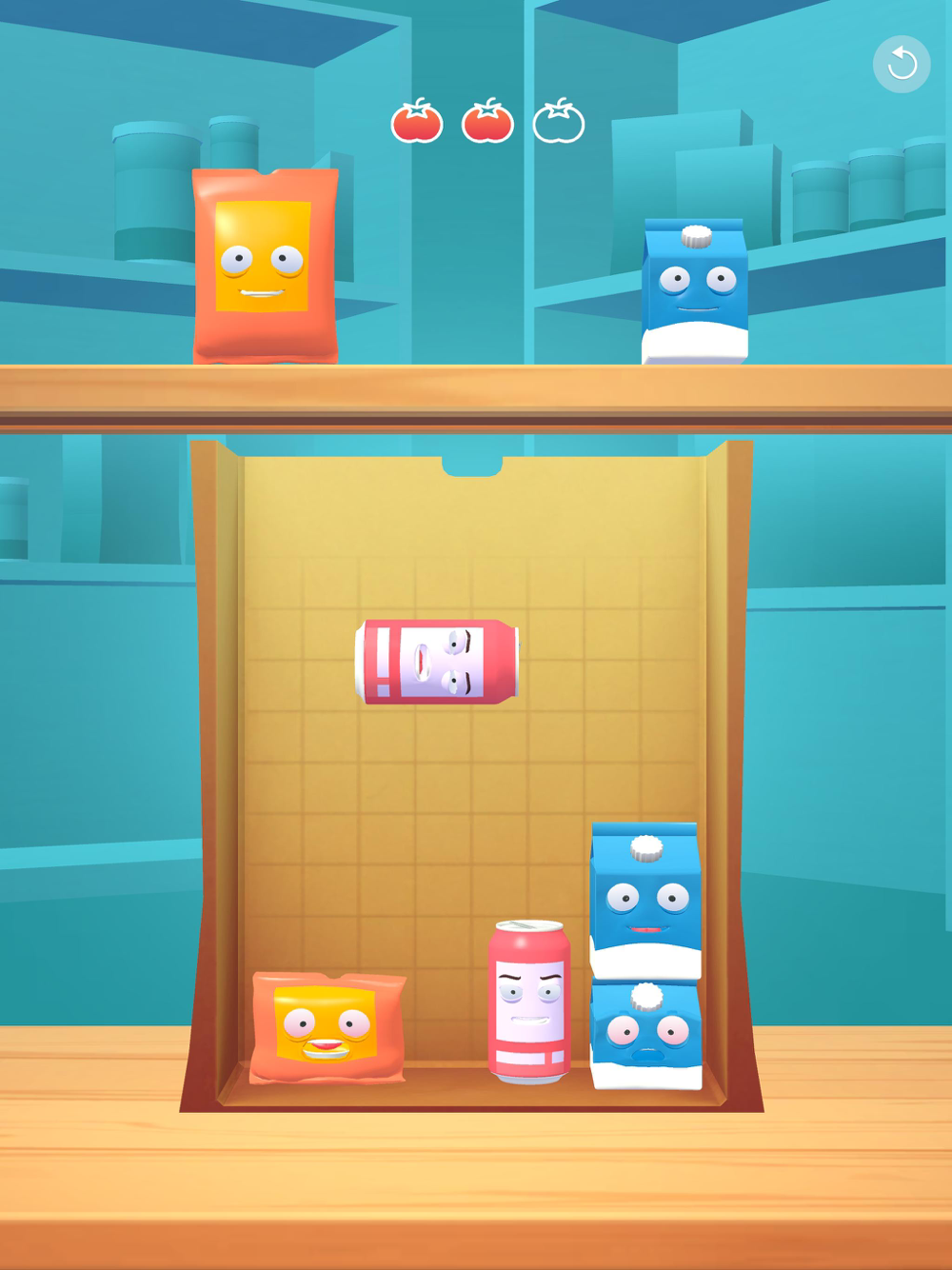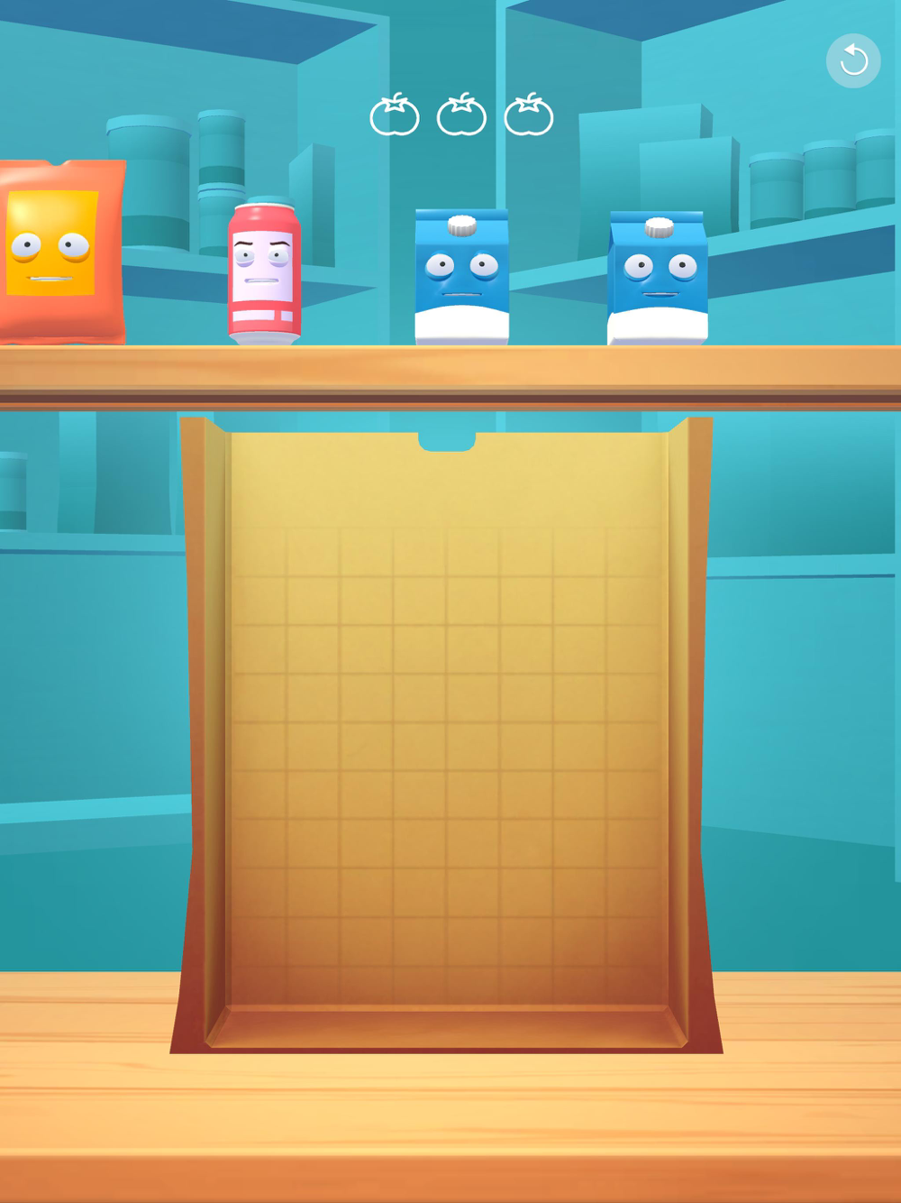 Place and rotate groceries in the bag while being careful not to crush them with the heavy ones. How much can you fit in the bag? Test your skills, stack the groceries in the most effective way.