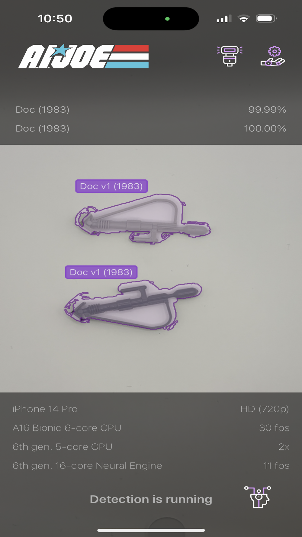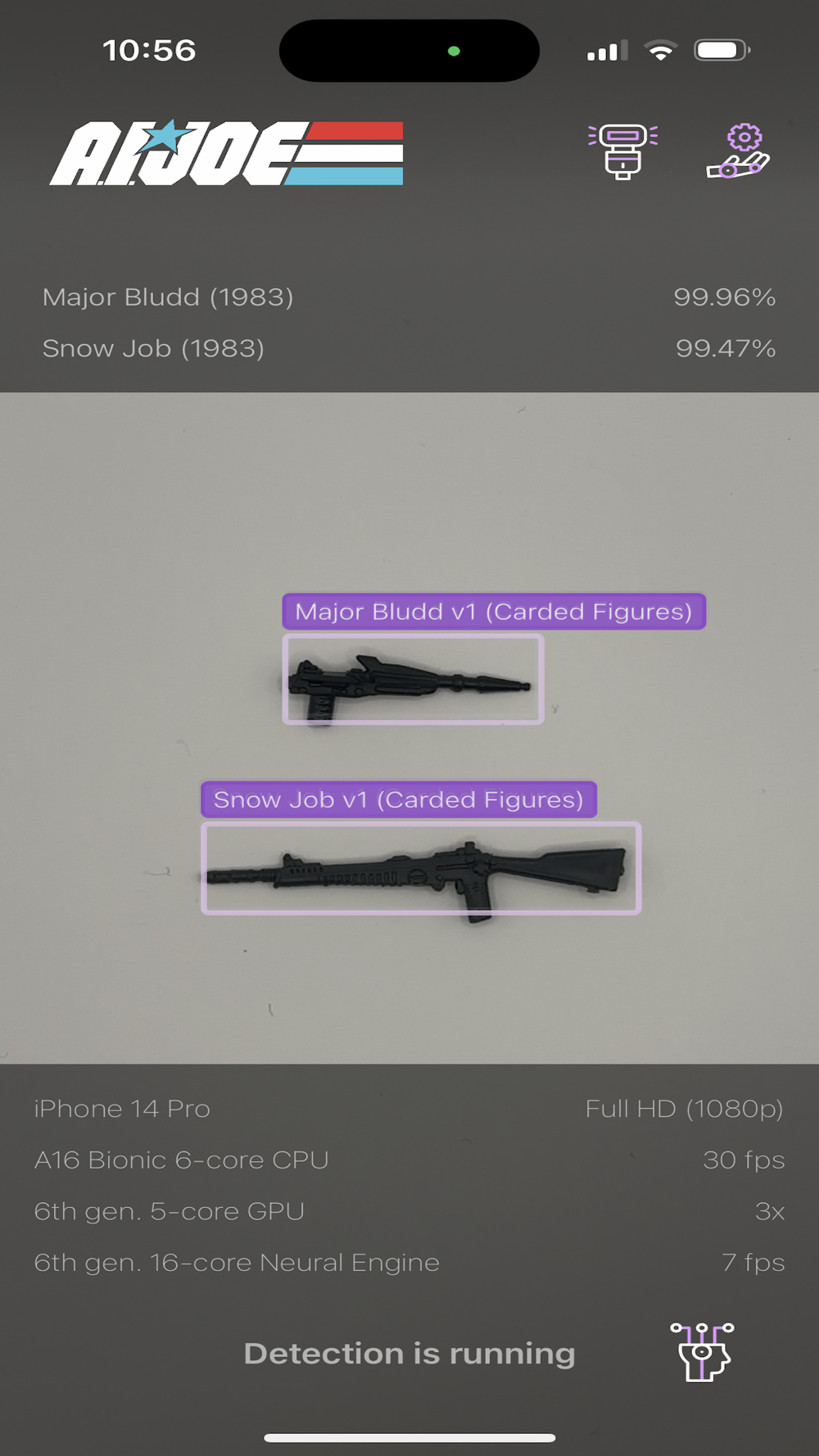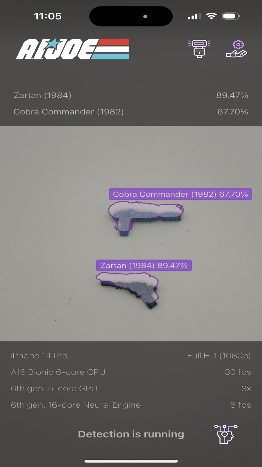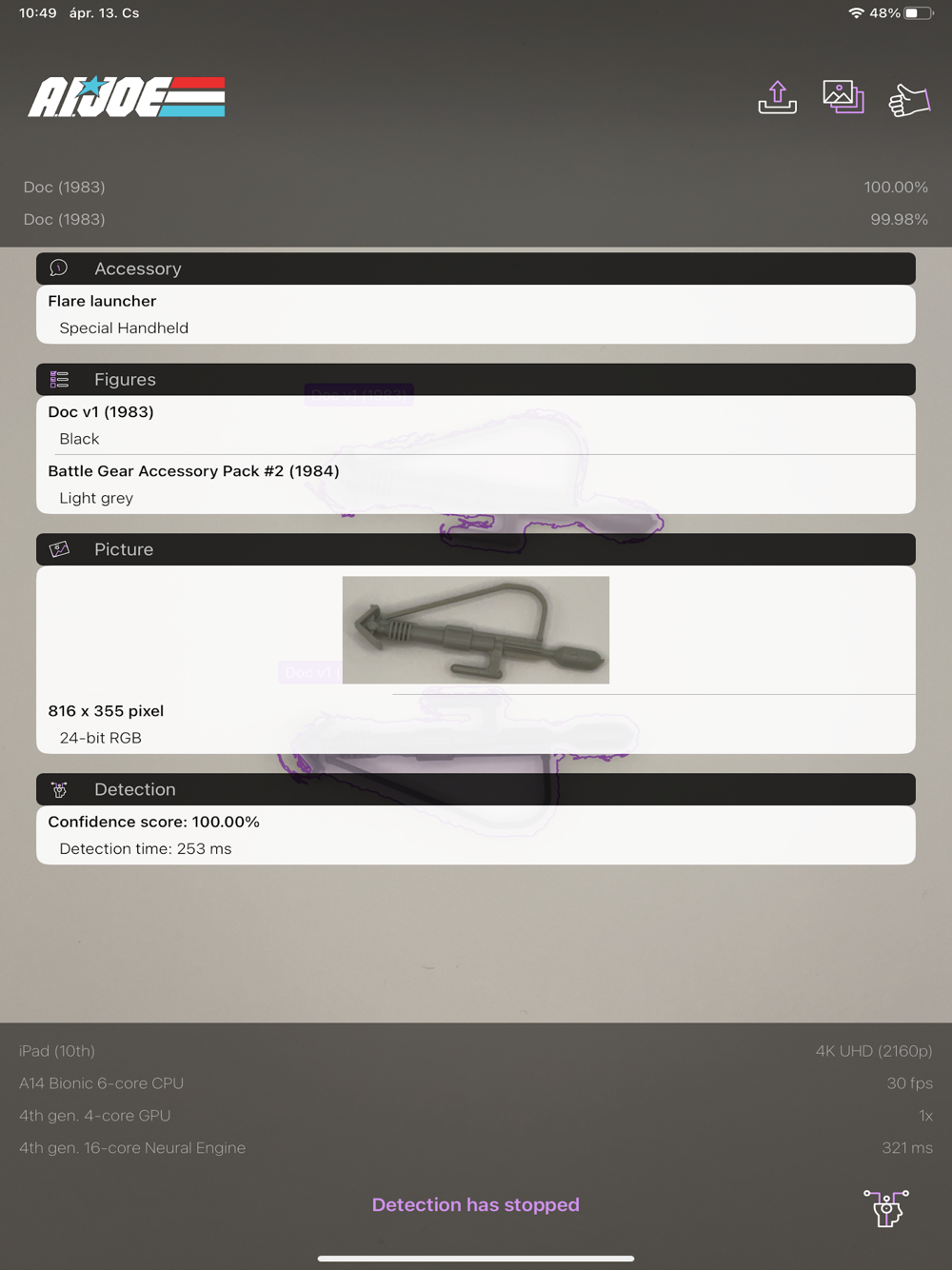 * By tapping on a detected object in the camera image, the application provides detailed information about the GI Joe accessory. Different color variations of an accessory are recognized by the model as the same.