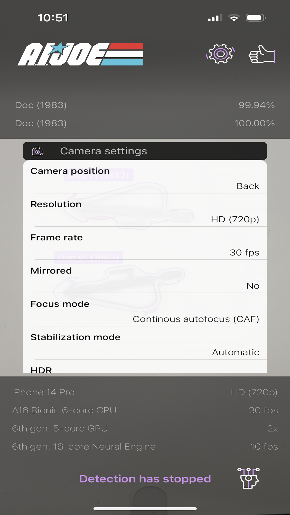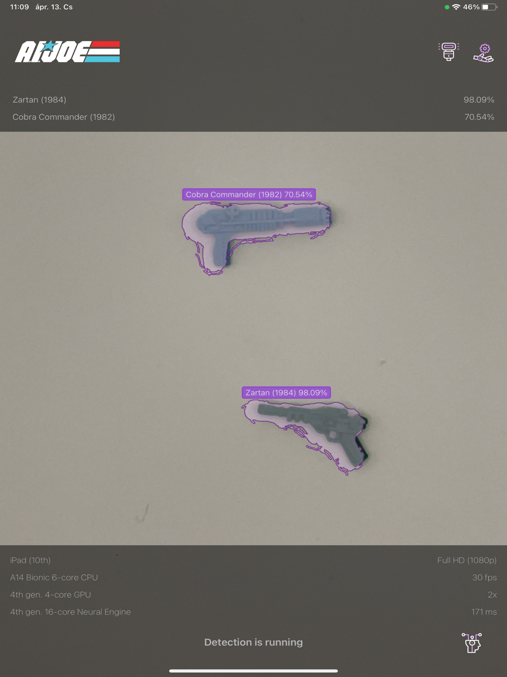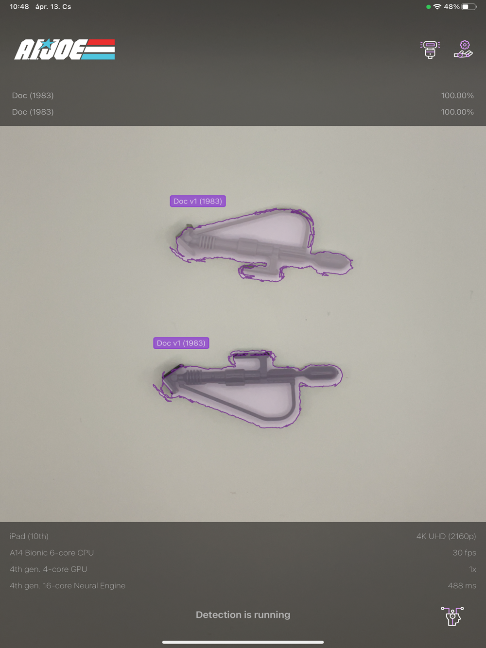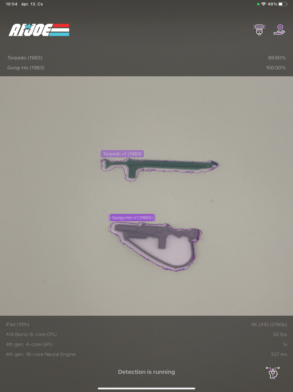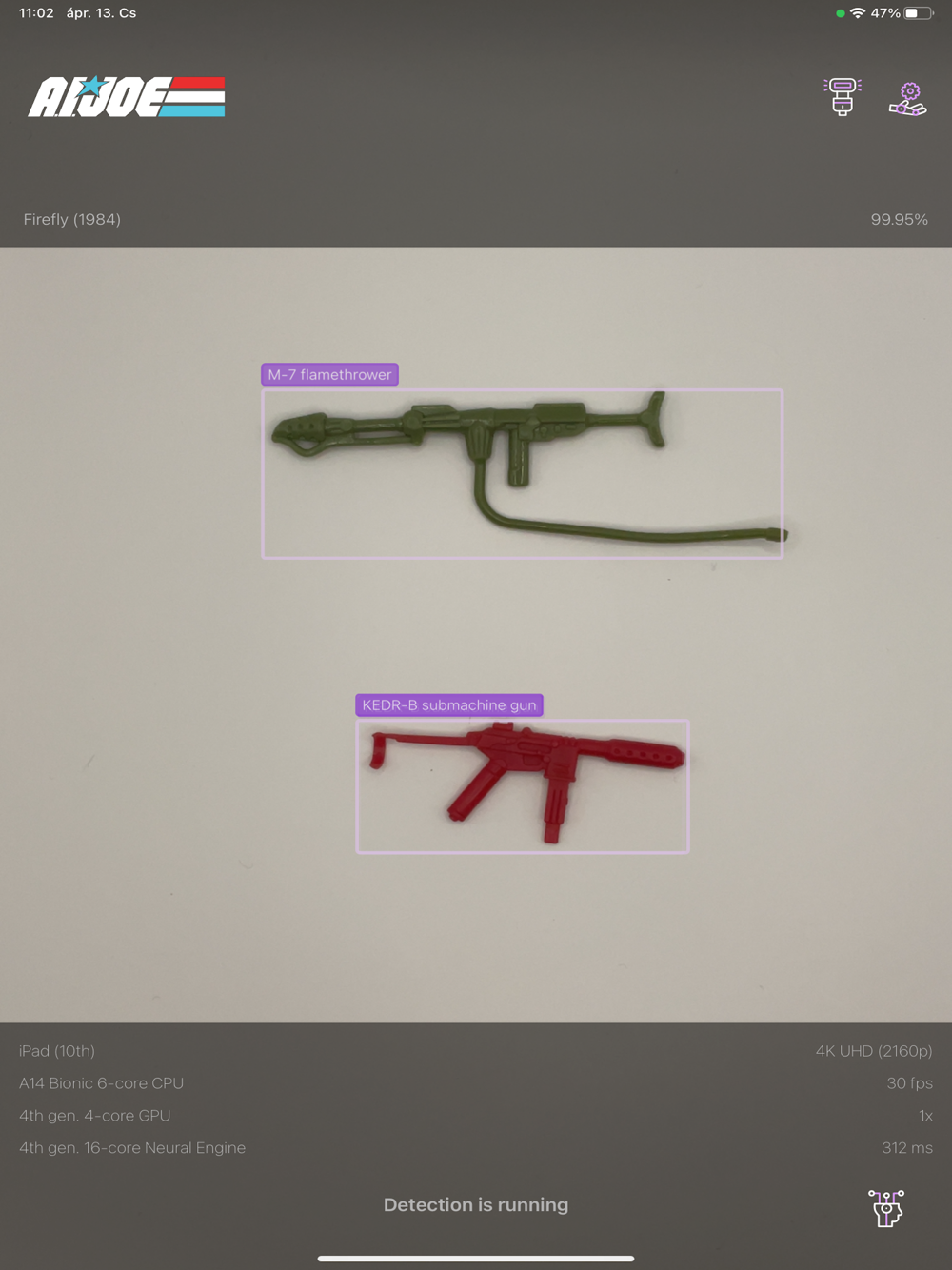 * By tapping on a detected object in the camera image, the application provides detailed information about the GI Joe accessory. Different color variations of an accessory are recognized by the model as the same.