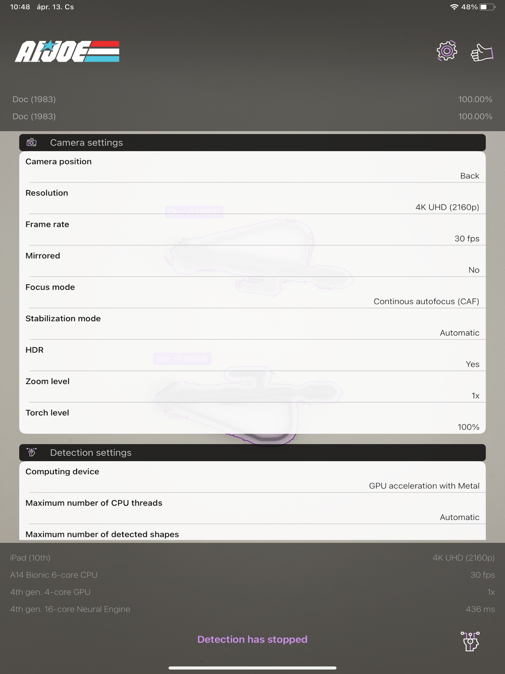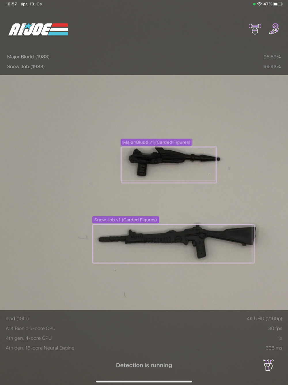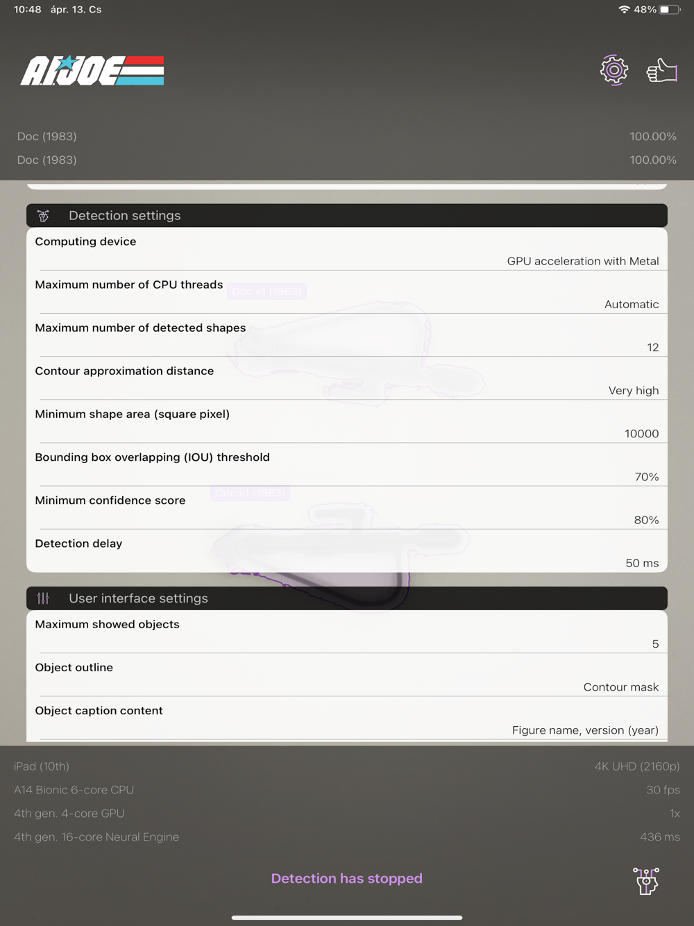 * AI Joe can use the device's GPU, as well as the Apple Neural Engine processor, if available. The recognition speed may be affected by the computing component used. Using the machine learning model is an extremely computationally intensive task, which is why the device may overheat during long use.