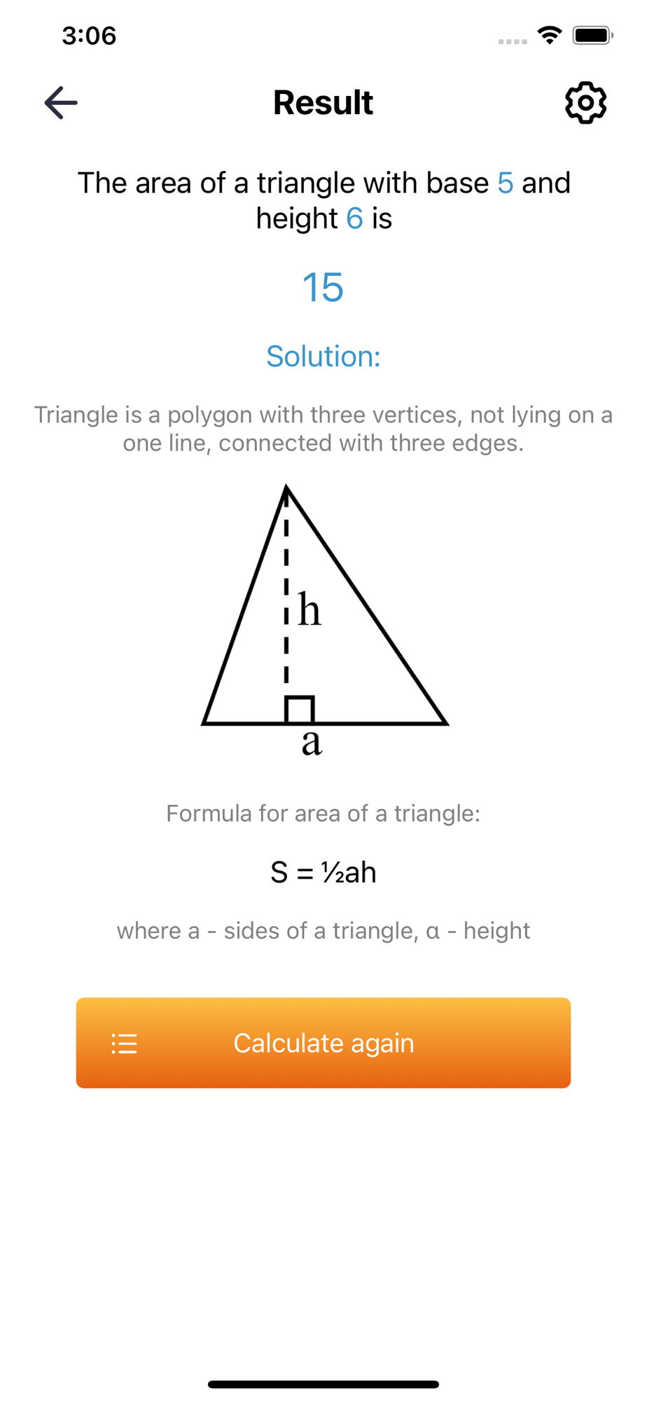 Area of a triangle, equilateral isosceles triangle area formula calculator allows you to find an area of different types of triangles, such as equilateral, isosceles, right or scalene triangle, by different calculation formulas, like Geron's formula, length of triangle sides and angles, incircle or circumcircle radius.