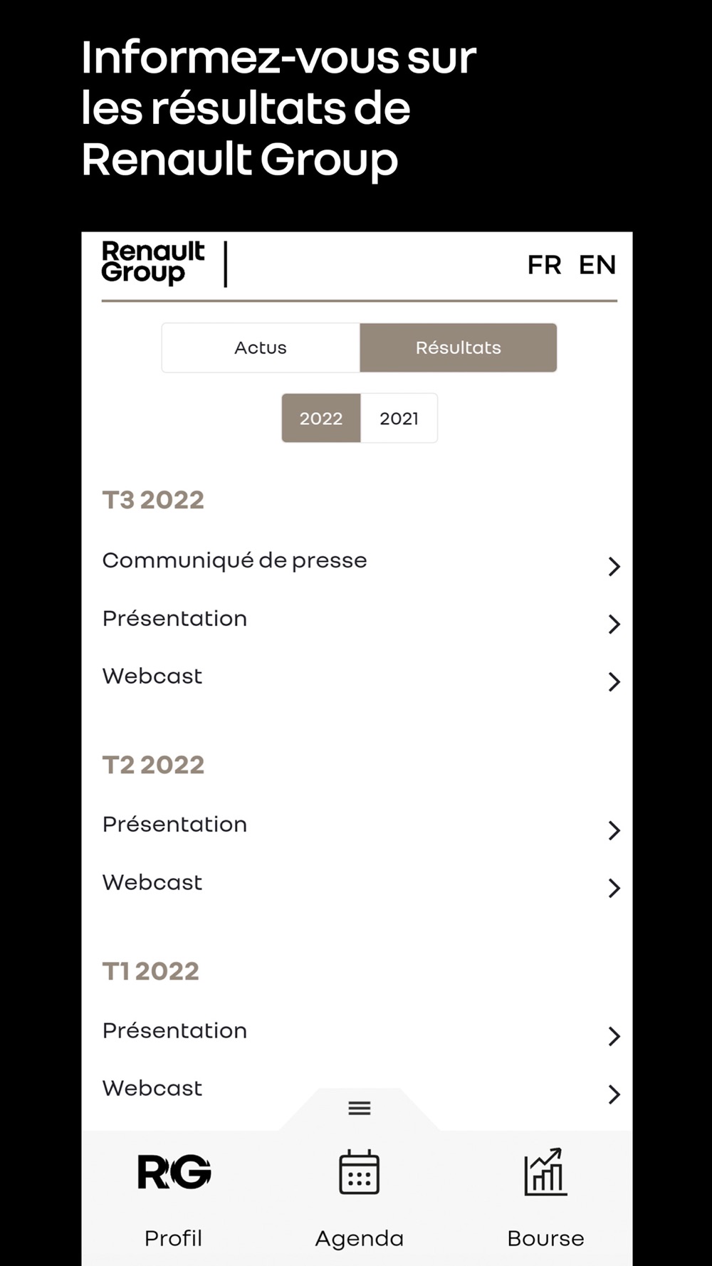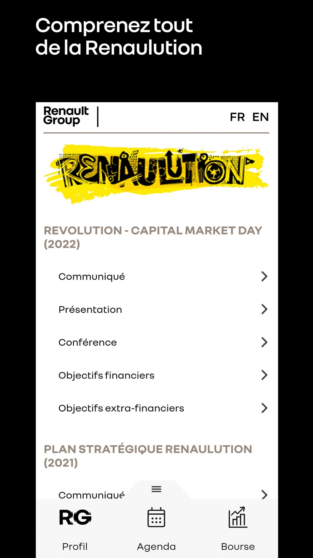 L’application Renault Group Invest’R permet aux investisseurs, analystes, actionnaires individuels et médias de s’informer et de suivre en temps réel les actualités financières de Renault Group.