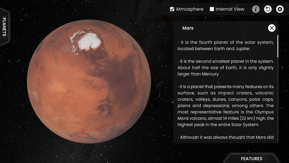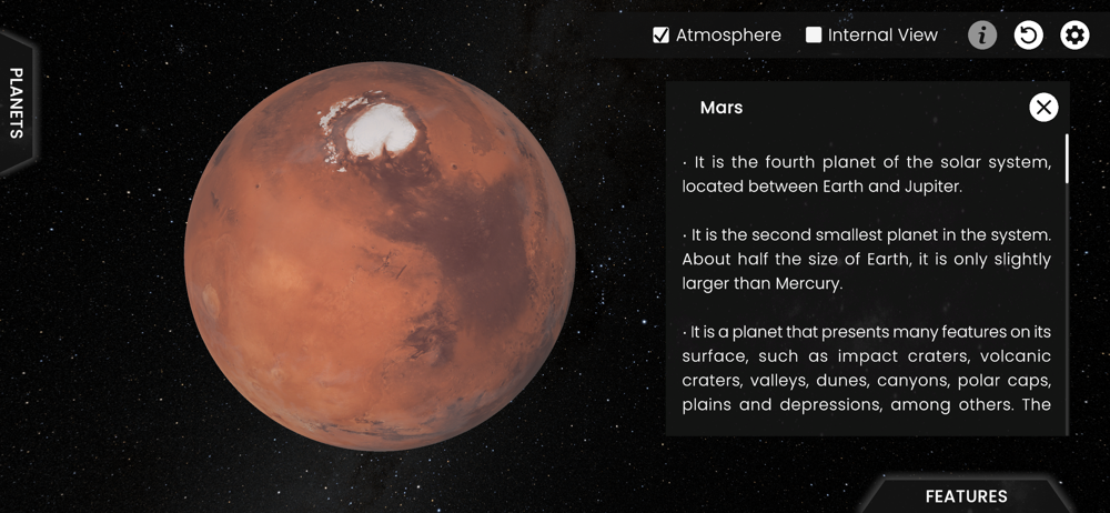 Teia is an application that represents the solar system using 3D models. But, unlike the rest of the applications published in the stores, the objective of this application is to show the objects that this system is composed of by teaching perceptible and localizable curiosities on the surface of the planets.