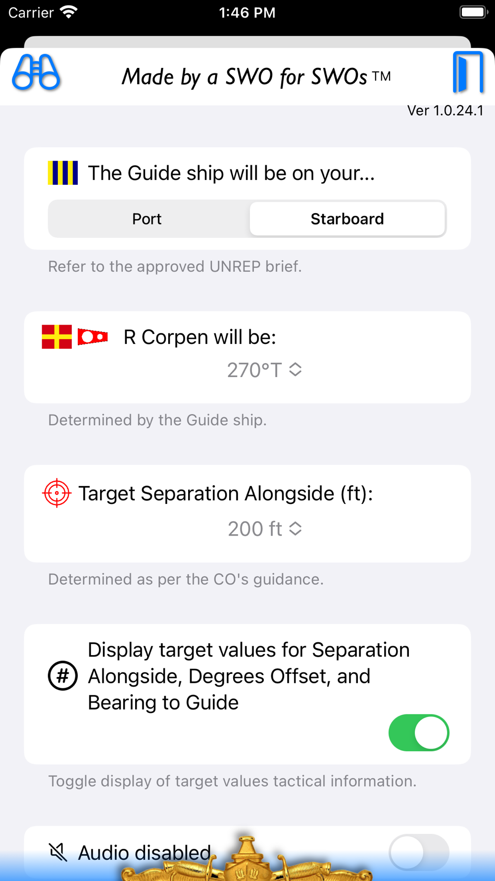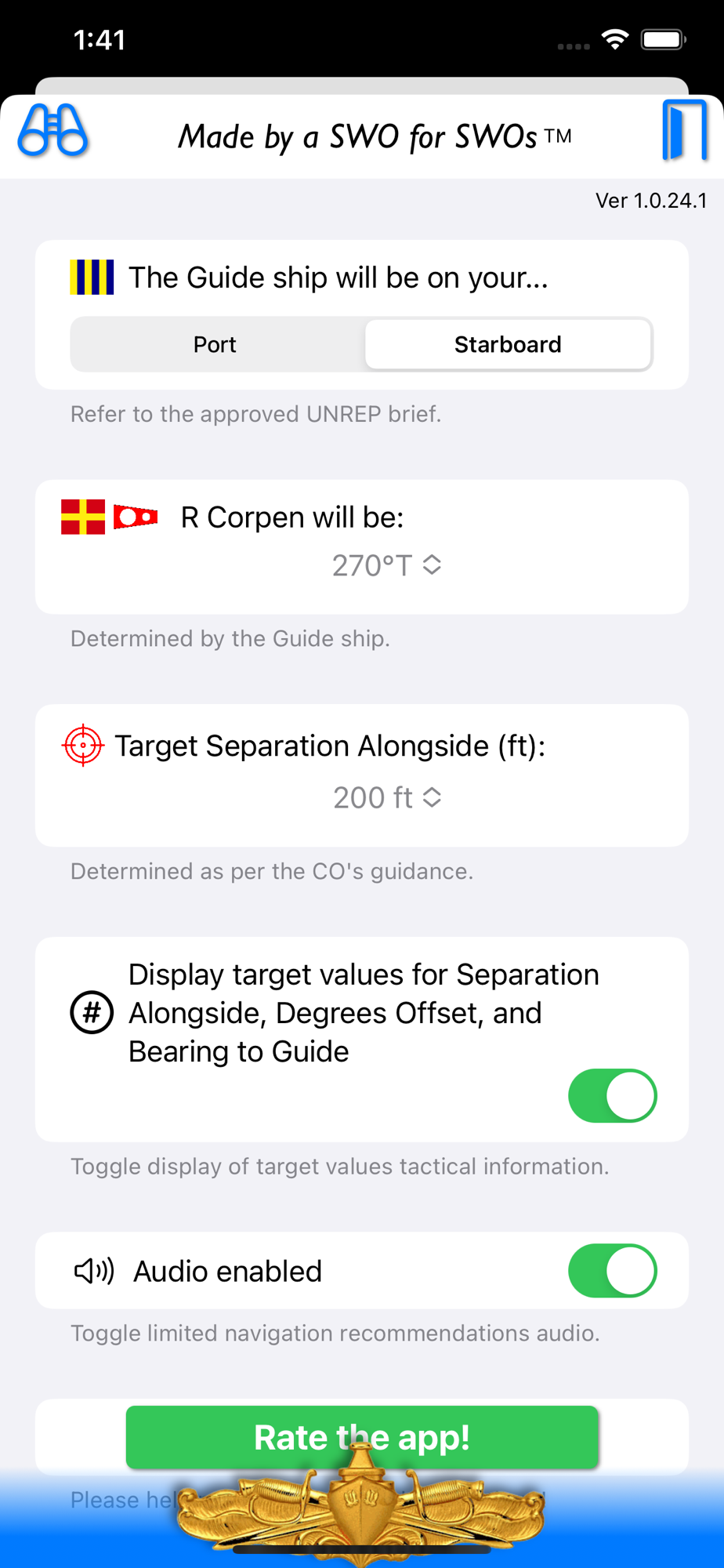 Designed from the ground up with the Conning Officer in mind, SWO Radian Rule provides an intuitive, user-friendly interface that clearly displays all of the critical information you need at a glance. Simply dial-in the appropriate Degrees Offset and Range to Guide, and SWO Radian Rule will do the rest, instantly calculating estimated Separation Alongside, target Degrees Offset, and your target Bearing to Guide. SWO Radian Rule allows you to select on which side of your ship the Guide will be (PORT or STBD), R Corpen, and target Separation Alongside. And, SWO Radian Rule is compatible with Darken Ship requirements, just in case you're conducting a night time UNREP.