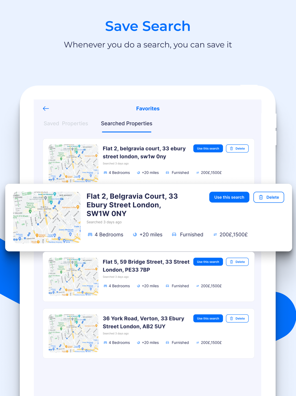 At the tap of a button, you can save your favorite properties and searches, and share them with friends and family.