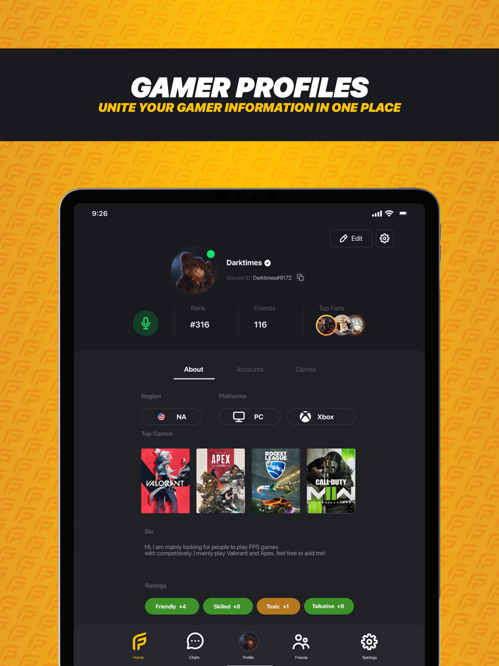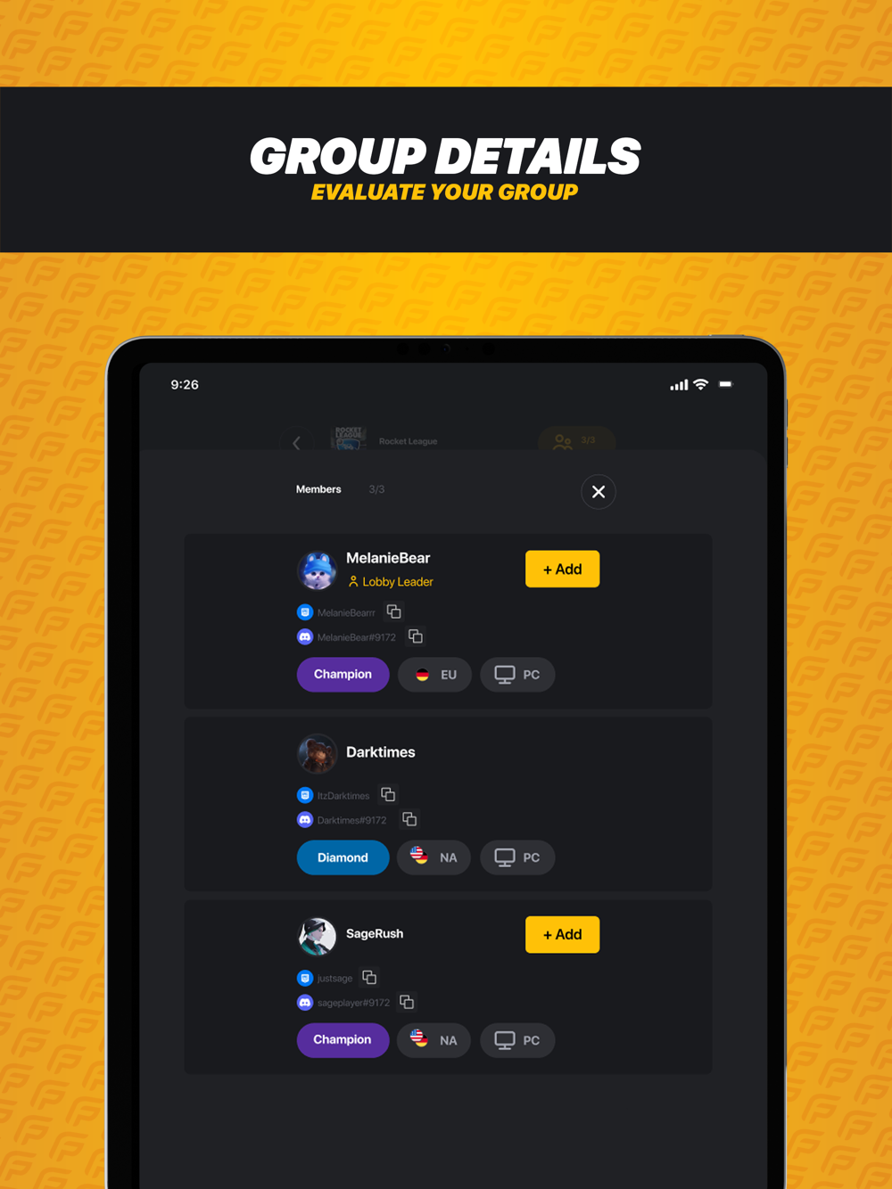 Once you've found your perfect LFG, kick off your team and go for the win. And while you're waiting for the match to start, PlayerFinder offers in-app chat with your squad, so you can stay connected and strategize together. You can also easily see your squad's gaming and social links so that you can connect with them in-game and out of the app.