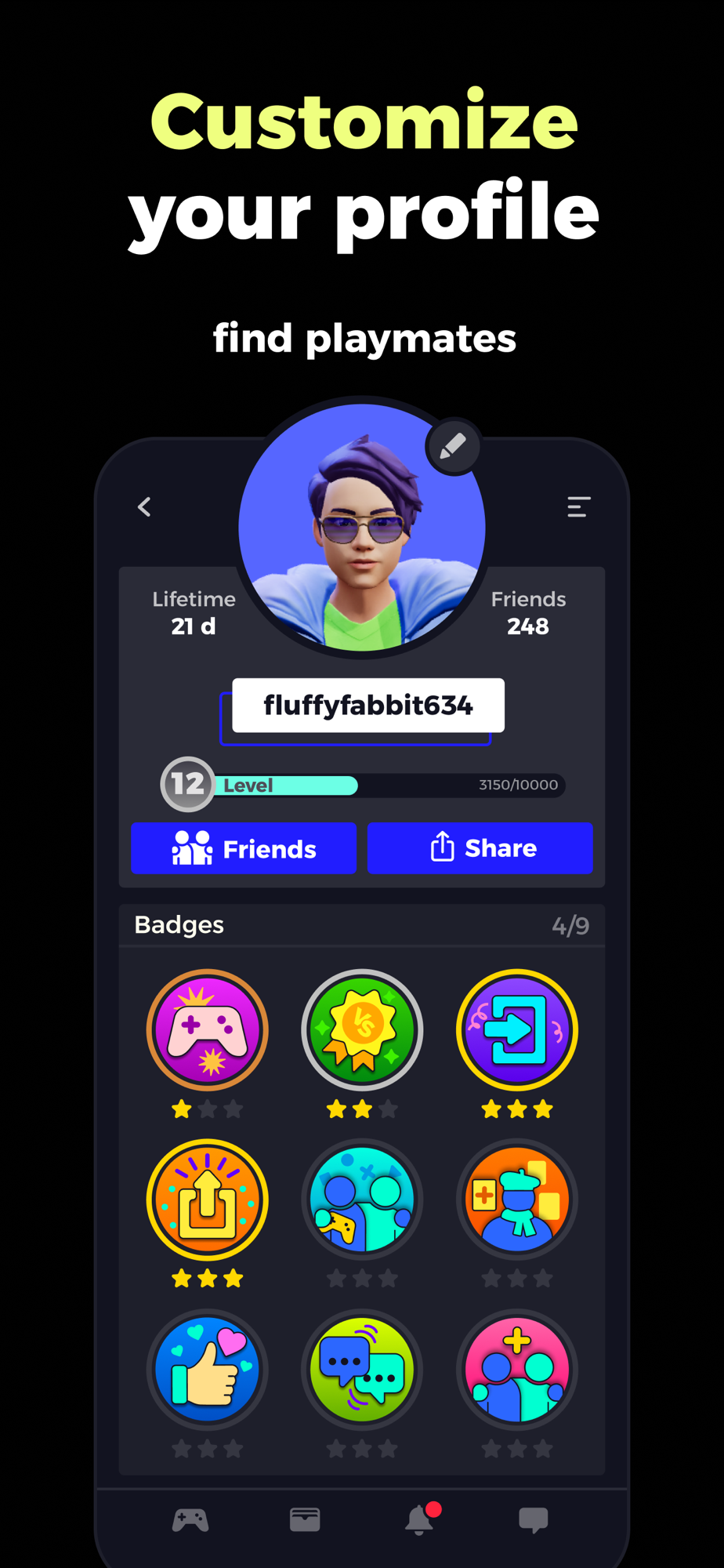 Compete in tournaments and challenges to demonstrate your gaming skills and climb the leaderboard. You will see your friends in those leaderboards. Complete quests to earn different badges and display them on your profile! You can also play with your friends and see who is the boss!