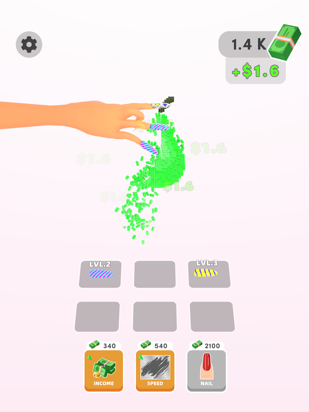 Earn more game coins by scratching the pixel arts with nails and merge the nails to upgrade them.