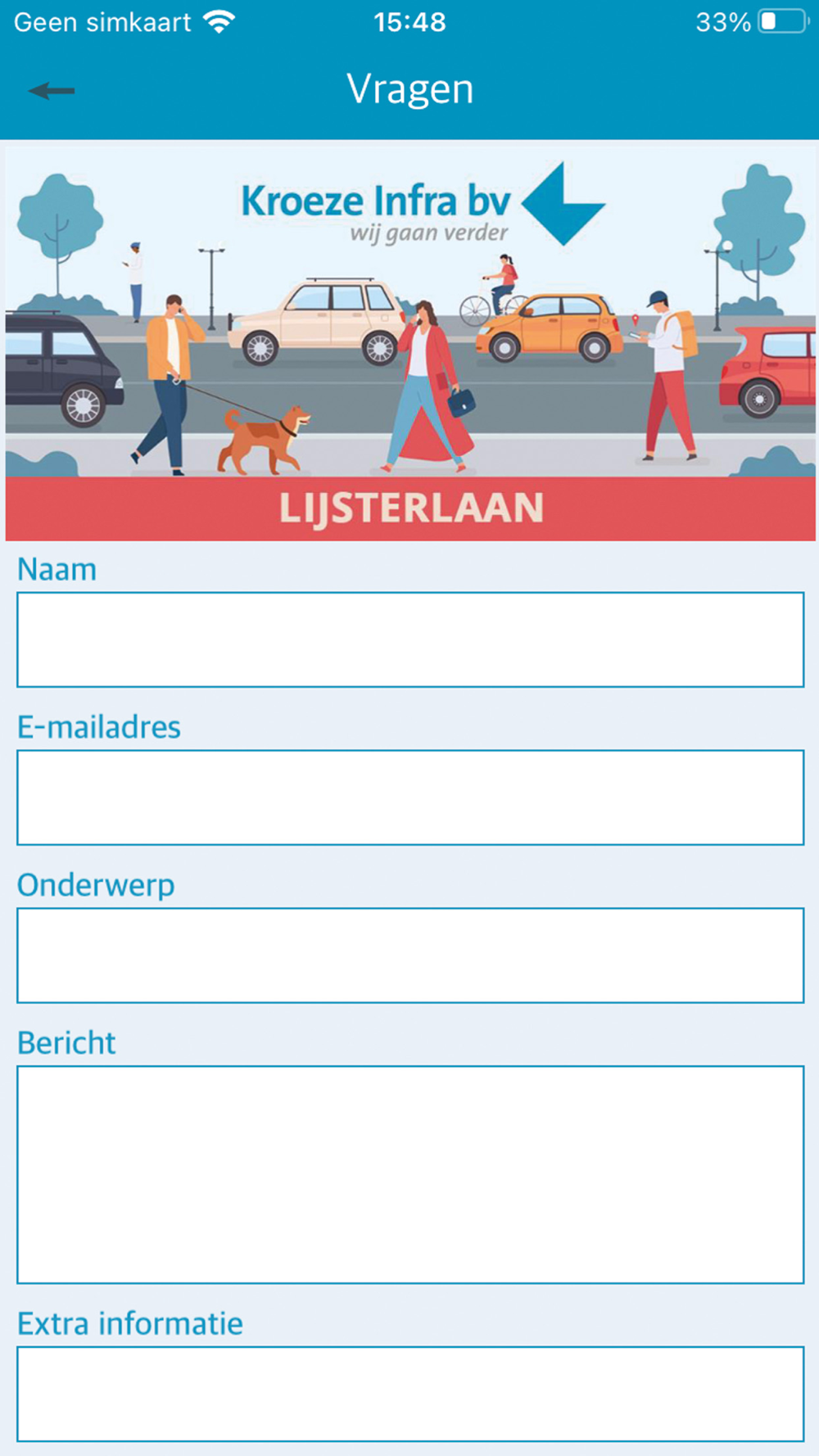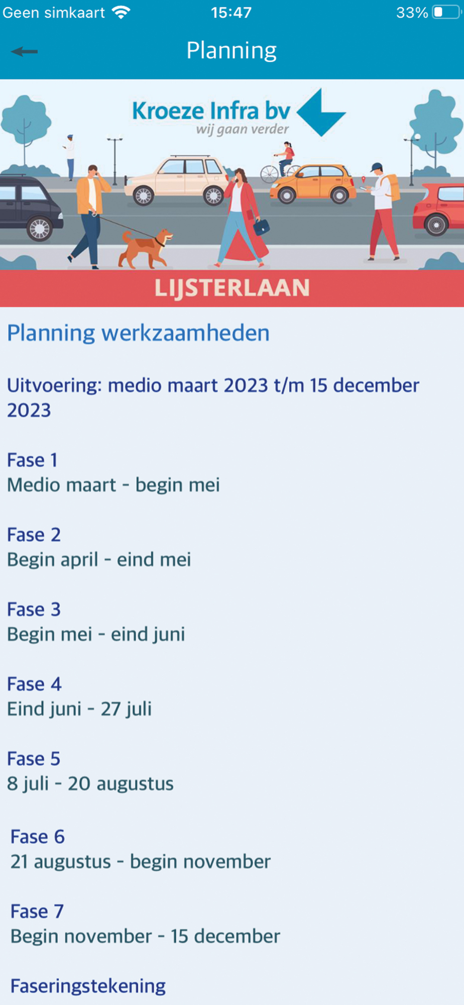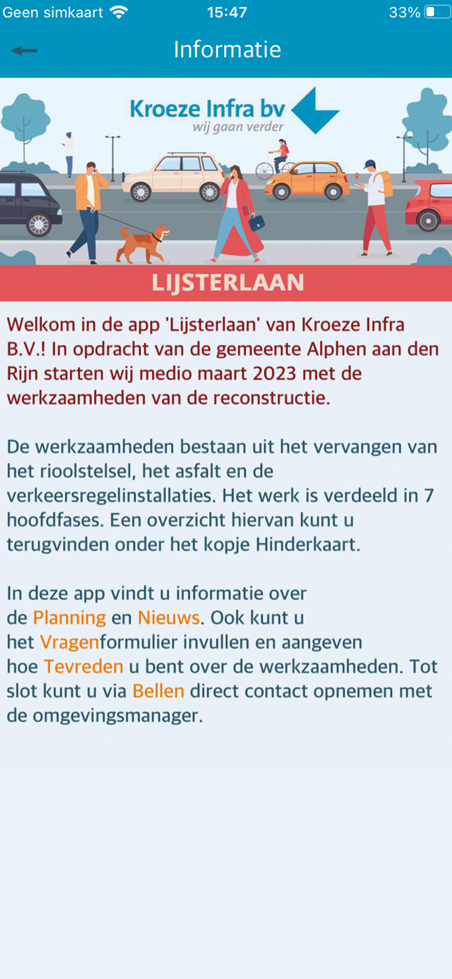 In deze app vindt u alle informatie over de werkzaamheden van het herinrichtingsproject 'Lijsterlaan' van Kroeze Infra BV. Er wordt belangrijke projectinformatie, de laatste planning en contactinformatie weergegeven . Ook kunt u op deze app vragen, opmerkingen of klachten achterlaten die betrekking hebben op het project.