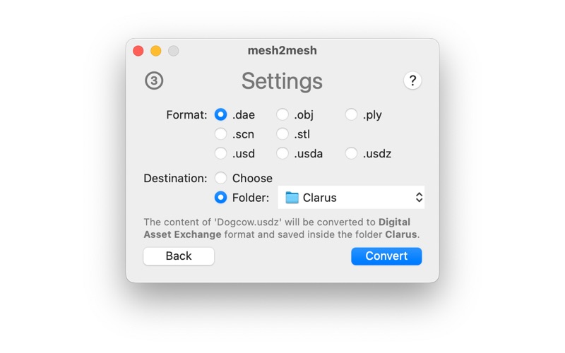 - Supports conversion from/to multiple formats: .dae, .obj, .ply (ASCII), .scn, .stl (ASCII), .usd, .usda, .usdz
