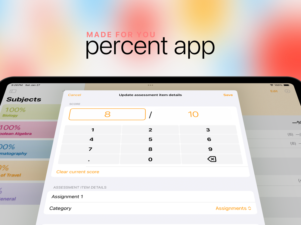 percent is your personal grade calculator — find out what you need to get on your next assignment to stay on top of your goals or even go above and beyond. percent is designed to be as intuitive as possible.