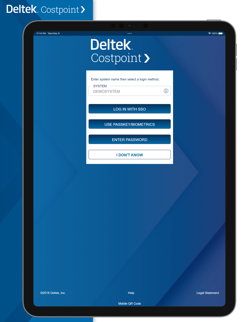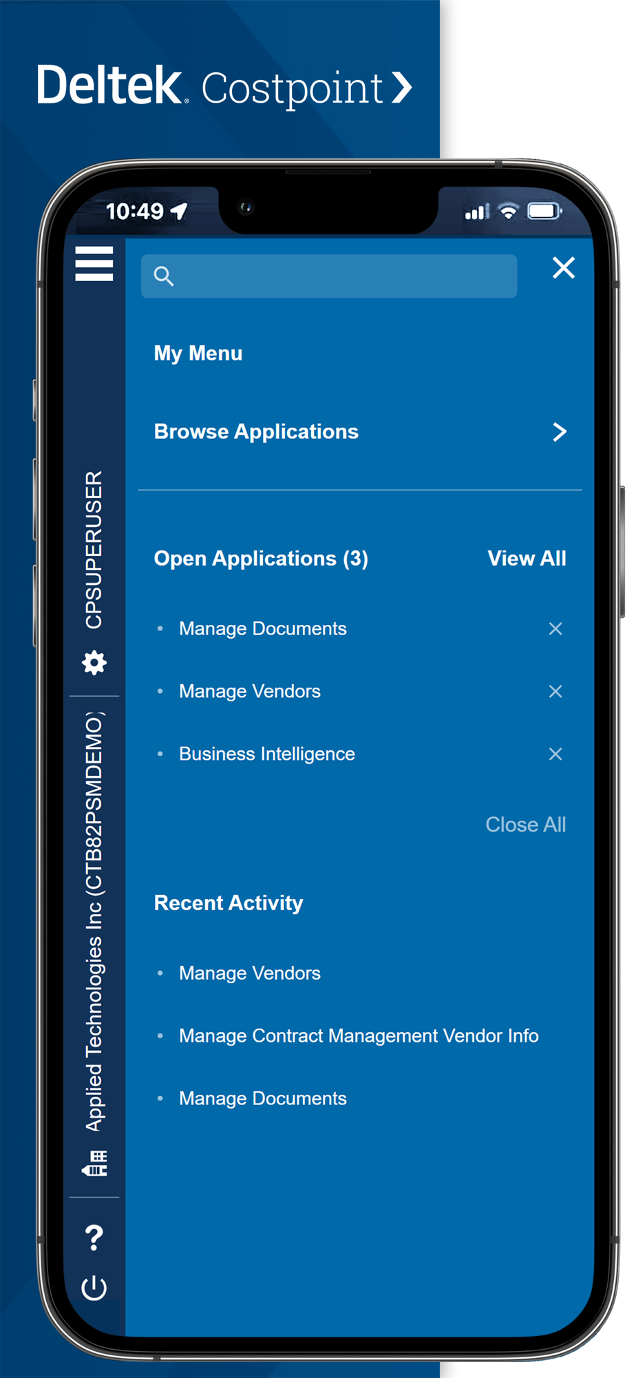 Deltek Costpoint mobile app offers access to all of the same functions/applications in Costpoint that a user would otherwise have access to through the browser – Enter/Approve Time, Voucher Approval, adding an employee, or any other domain/function within Costpoint. All security/authentication options available in Costpoint on a laptop are supported, including built-in device biometric authentication. Any extensions built for Costpoint, including UI extensions with new fields or new screens, are supported out of the box as well.
