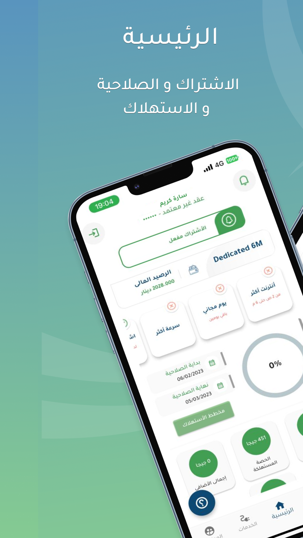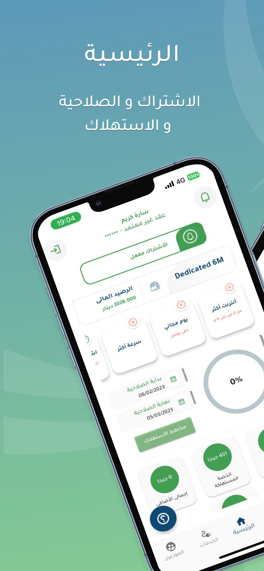 • إمكانية تغيير الباقه وتجديد الاشتراك واضافة جيجات اضافية،