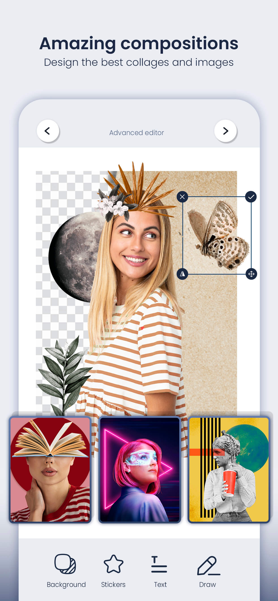 "Cut and paste photo editor allows you to cut images and make the background of an image transparent. Then you can use these images as stickers or to create fun photomontages and collages.