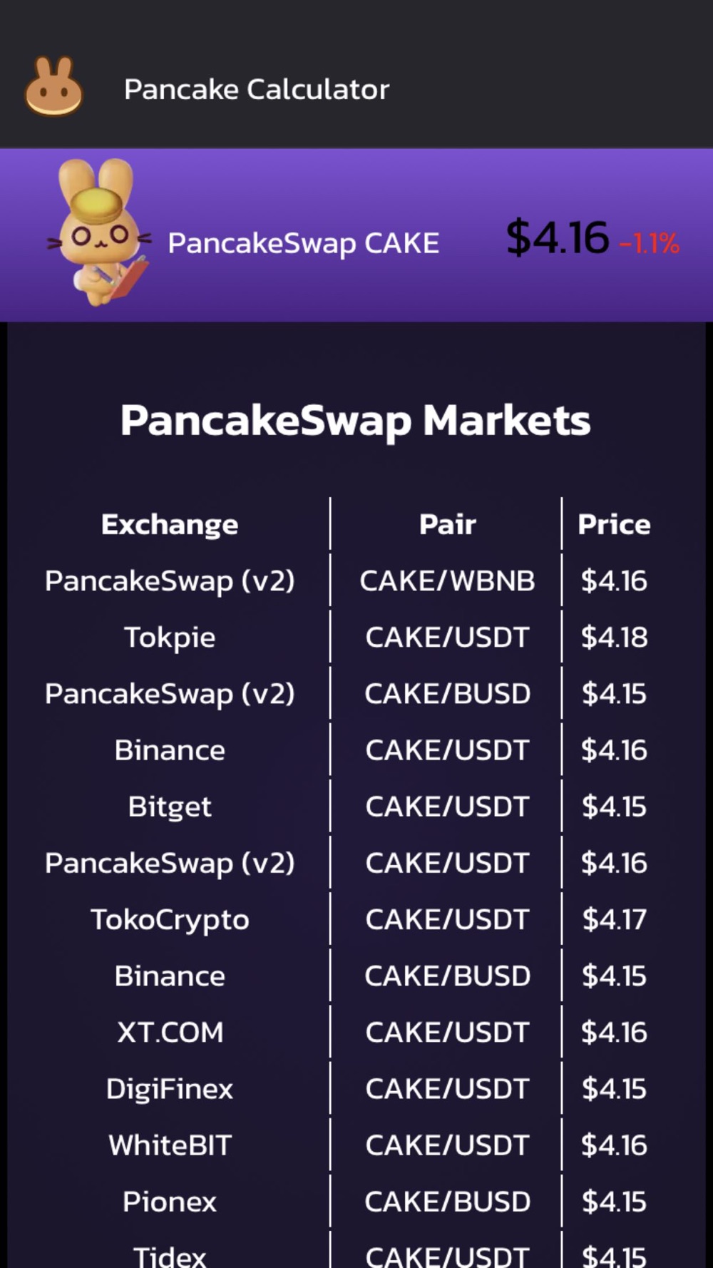 Pancake Calculator is the ultimate tool for keeping track of Pancake Token prices and statistics. With this app, you can easily monitor the Pancake Token exchange rate and track its performance over time. The app also provides live prices from popular marketplaces and exchanges, making it easy for you to compare prices and find the best deals.