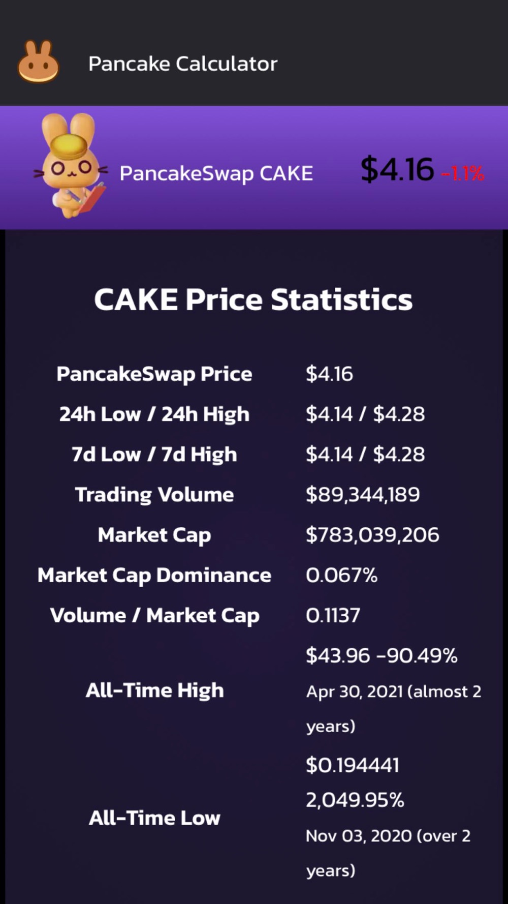 With Pancake Calculator, you'll always be up-to-date with the latest Pancake Token prices and market trends. Download the app today and start monitoring your investments like a pro!