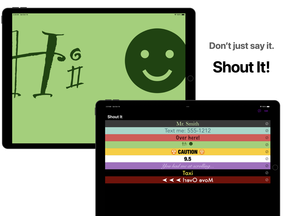 Shout It is a simple app that displays a message on your device in large, clear type with smooth scrolling without pixelation. Advanced features like cloud sync, unlimited messages, full-color picker, expansive font choices, and emoji support make this the best banner program on the App Store!