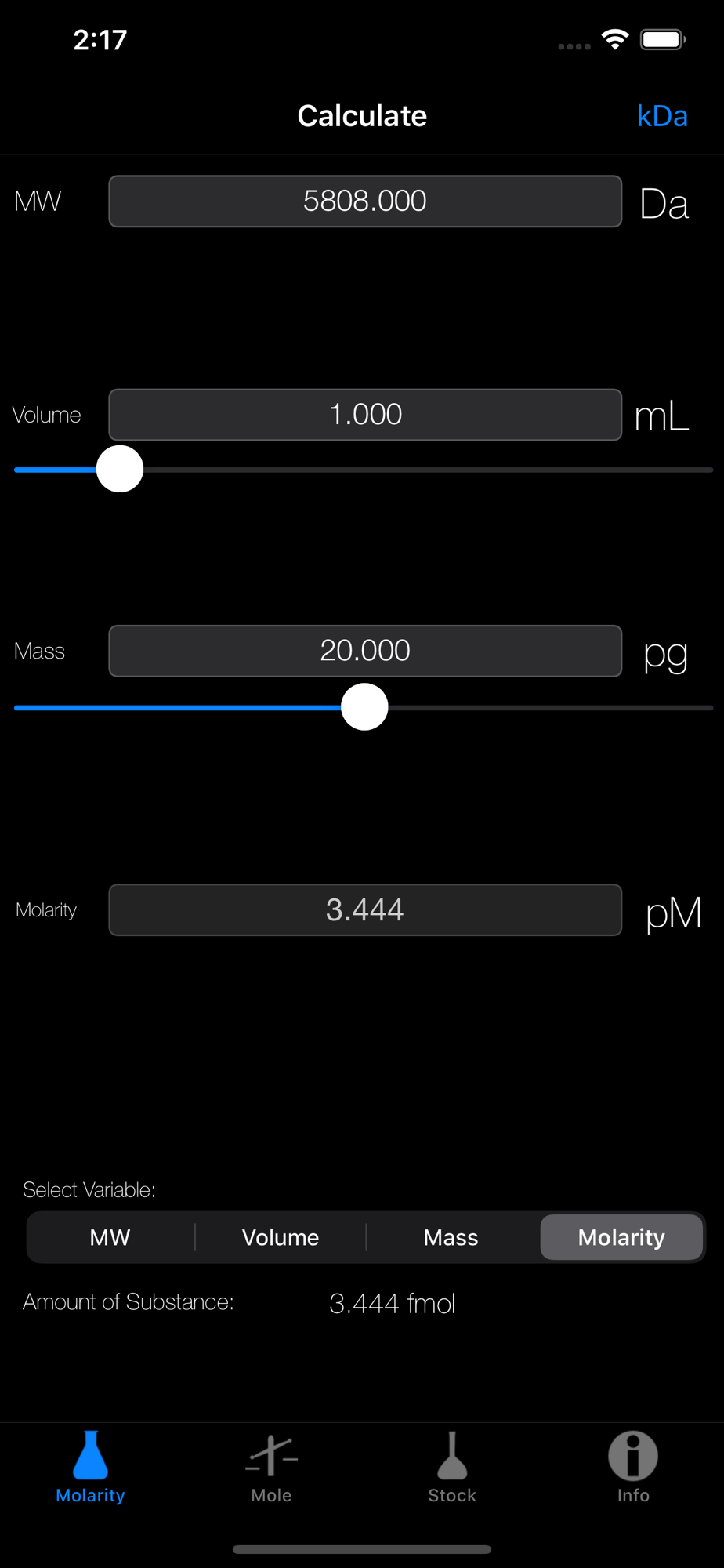 - Switch the molecular weight between Dalton and kilo-Daltons