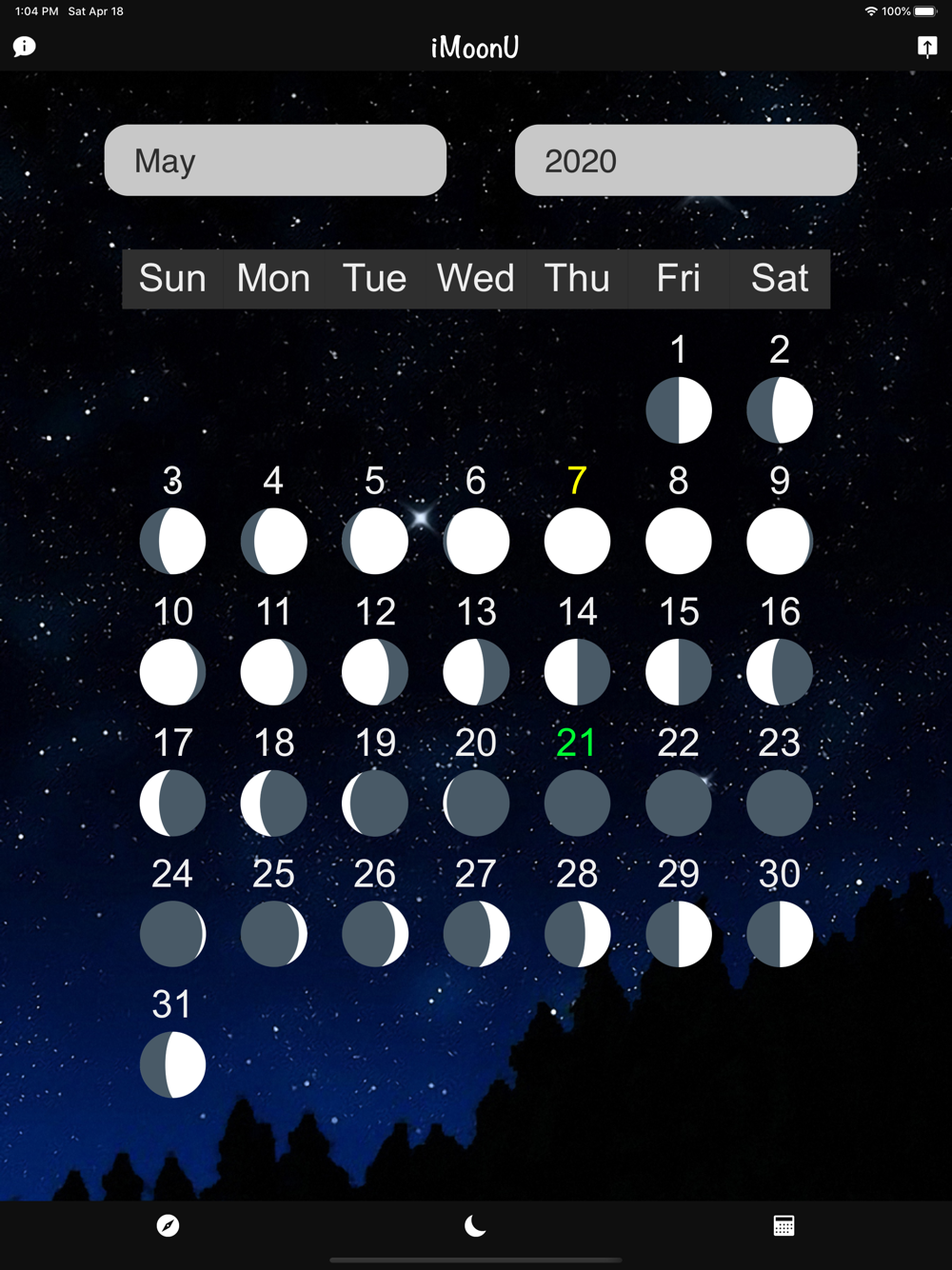Monthly moon phase calendars can also be displayed.