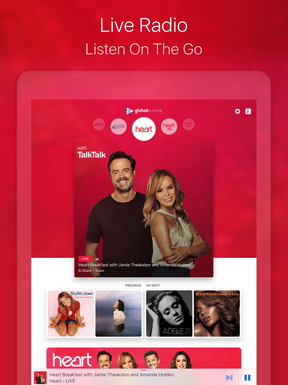 With the Heart App powered by Global Player we've made it easier than ever listen to your favourite shows on Heart! Whether you’re waking up with Jamie and Amanda on Heart Breakfast or partying the night away with Club Classics, use the Heart app to get closer to the music and presenters you love!