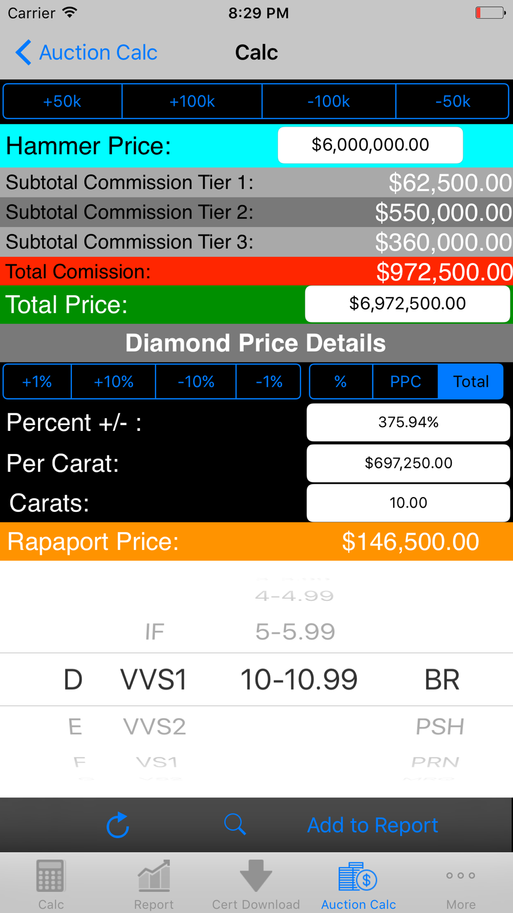 - Carats and percent input boxes for easy calculation of price per carat and total price.
