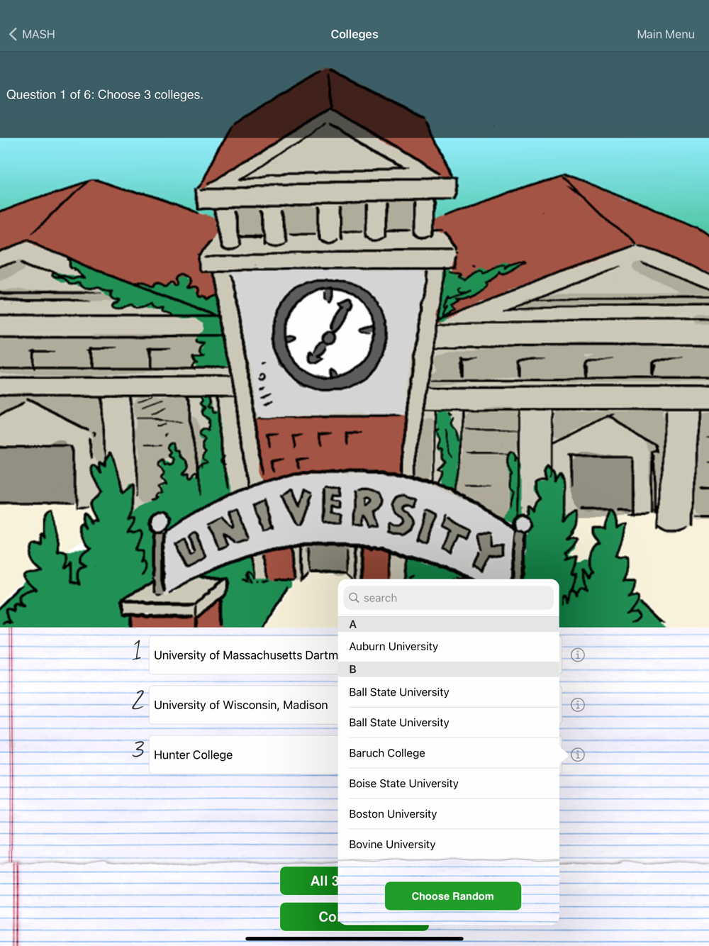 Play MASH (Mansion, Apartment, Shack, House) and find out where you'll go to college, what you'll do for a living, even how many kids you'll have, and much more. Play it with your friends!