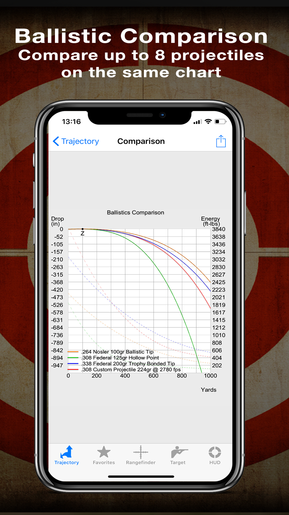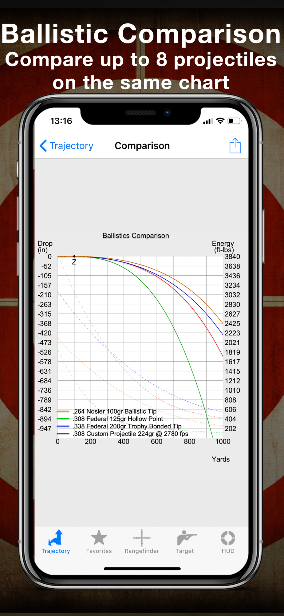 - Ballistic Charts: Display a chart of the current projectile including drop, energy, and velocity. Compare wind drift. Compare up to eight projectiles on the same chart. Zoom charts up to 300% and save a full size chart to your photo album.