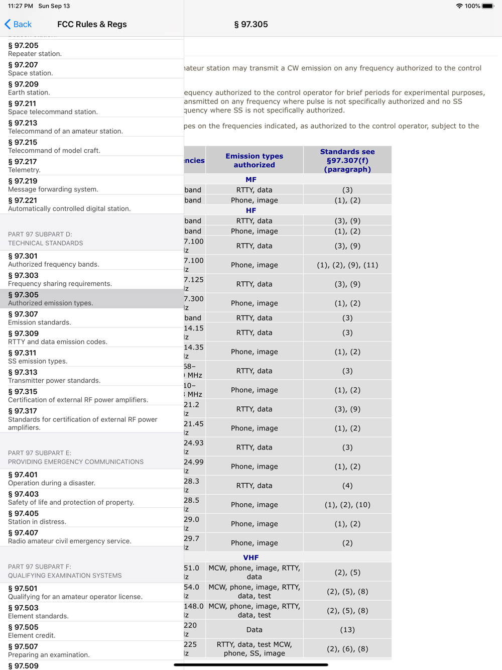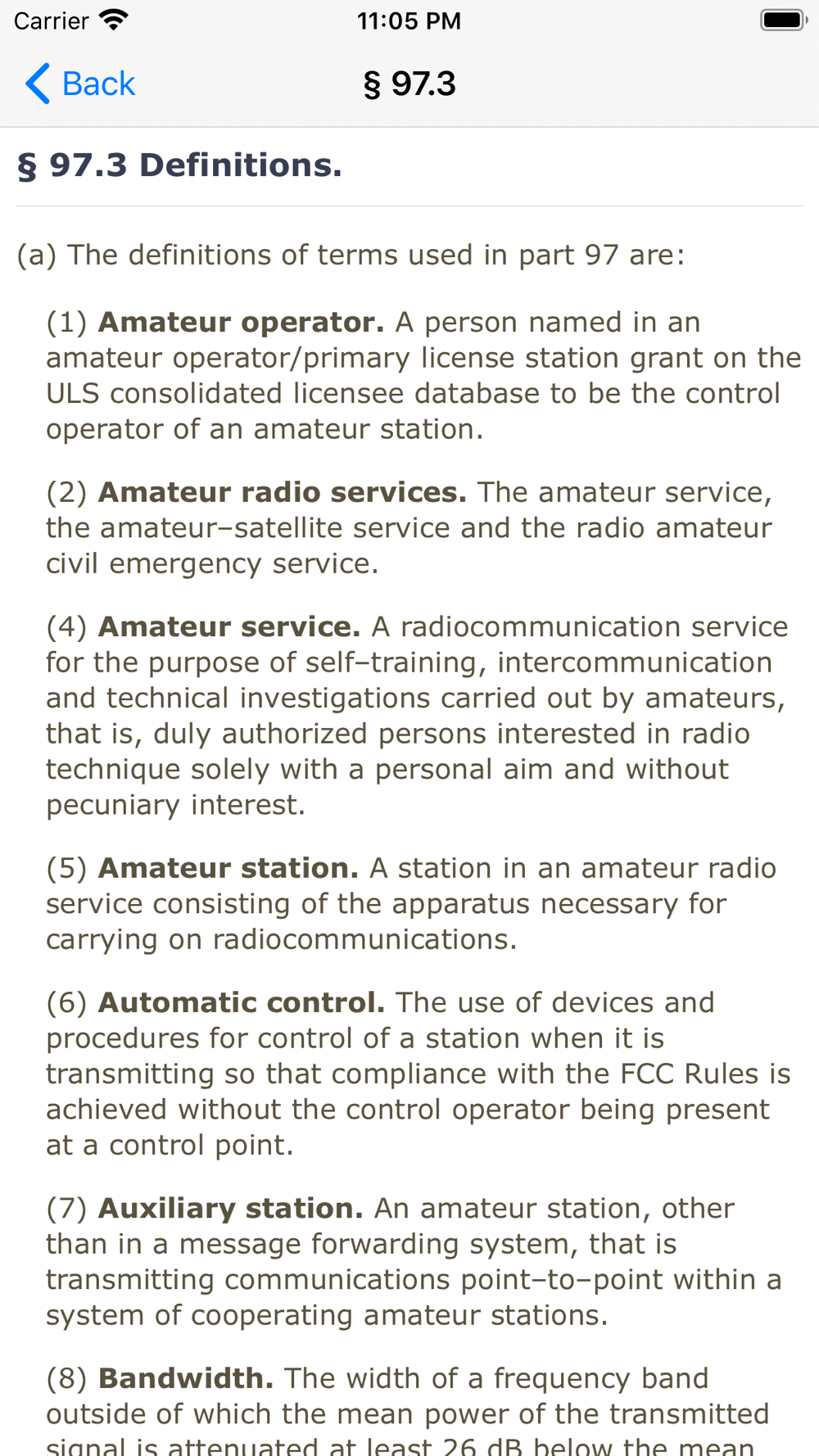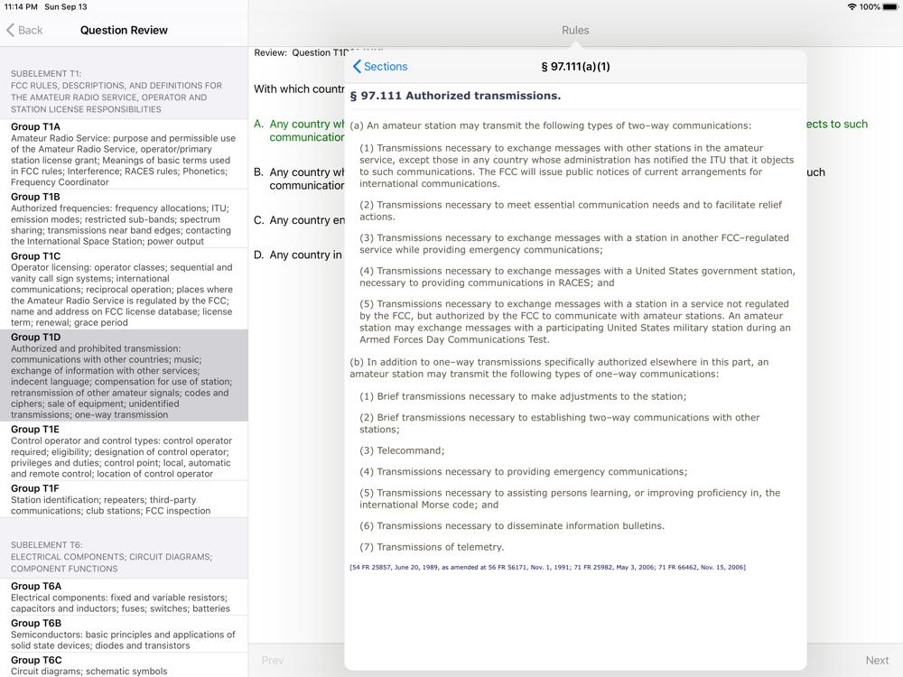 FCC rule text is viewable within the application. All sections can be browsed from the main screen. Additionally, for questions where rule sections have been identified, the rule text can be viewed on the question screen when studying the question pool or reviewing test results.