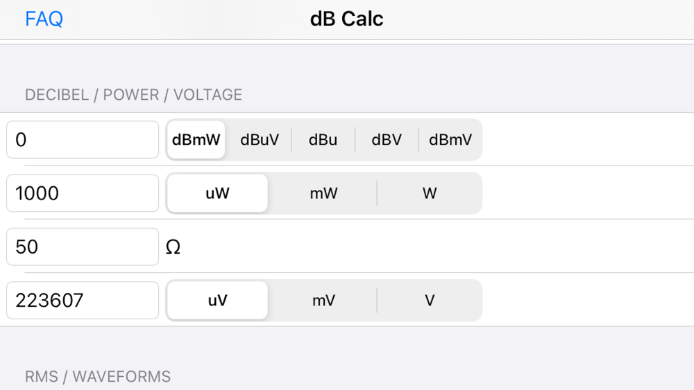 Need to quickly convert between various RF signal measurement units? dB Calc performs lots of decibel related conversions: